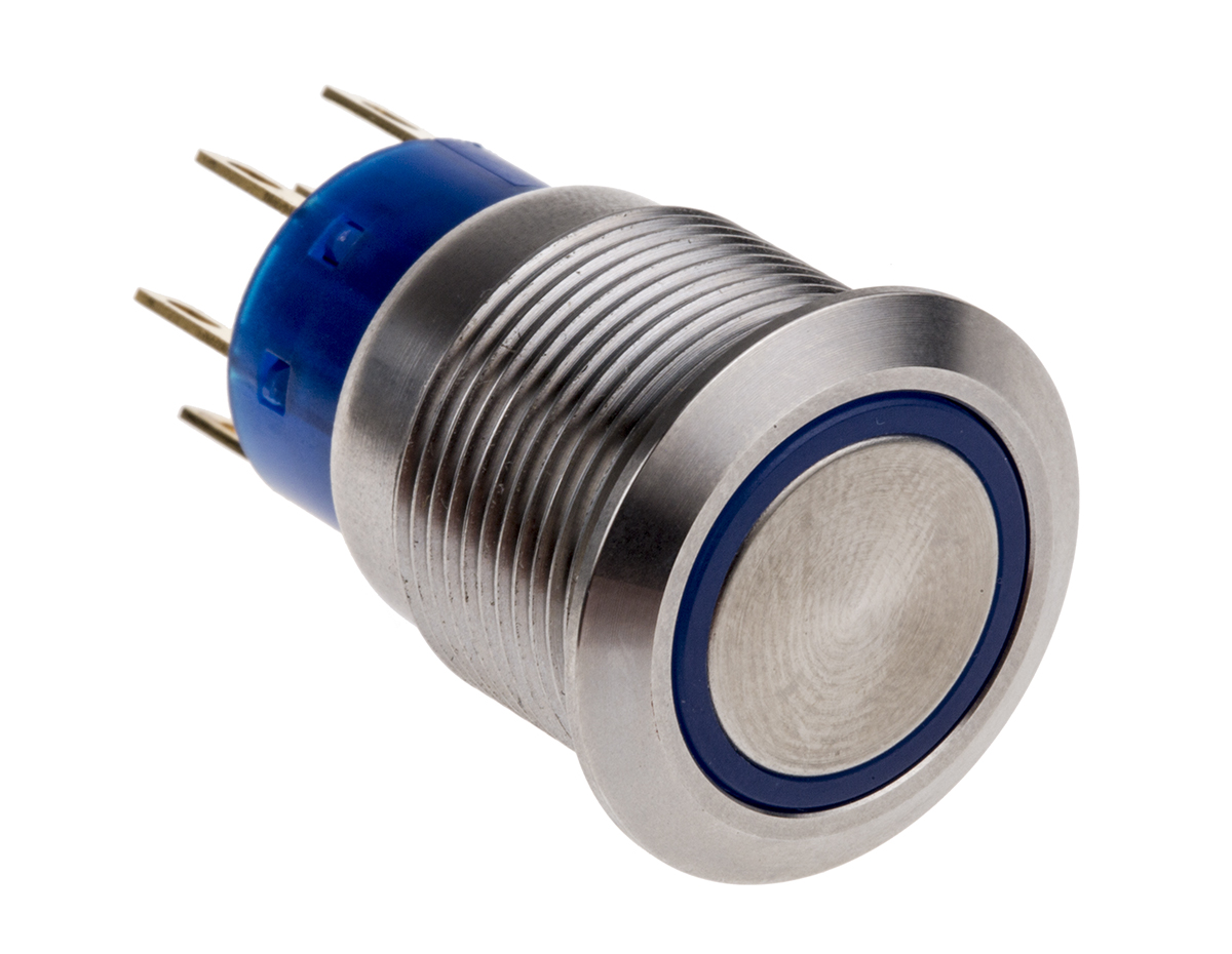 This is DPDT On-Momentary Push Button Switch IP67 19.2 (Dia.)mm Panel Mount Blue LED 28 V dc 250 V ac manufactured by KNITTER-SWITCH. The manufacturer part number is MAV19A0F20E-724-JR. Illumination Option yes. The product is available in panel mount configuration. It is IP rated with ip67. The rated contact current is 3 a. The panel has a 19.2mm cut-out diameter. Moreover, the product has a nominal 28 v dc, 250v ac voltage rating. It has about 28v contact DC voltage rating . This pushbutton has a round style pushbutton and is easy to use. The LED has an adorable blue colour. The contact is equipped with dpdt configuration. The product has an assigned mav19a0f20e-724-jr manufacturer part number. It provides momentary switch operation. Its contact AC voltage rating is about 250v . The terminal is a solder lug type. The product is made from sturdy copper alloy materials.