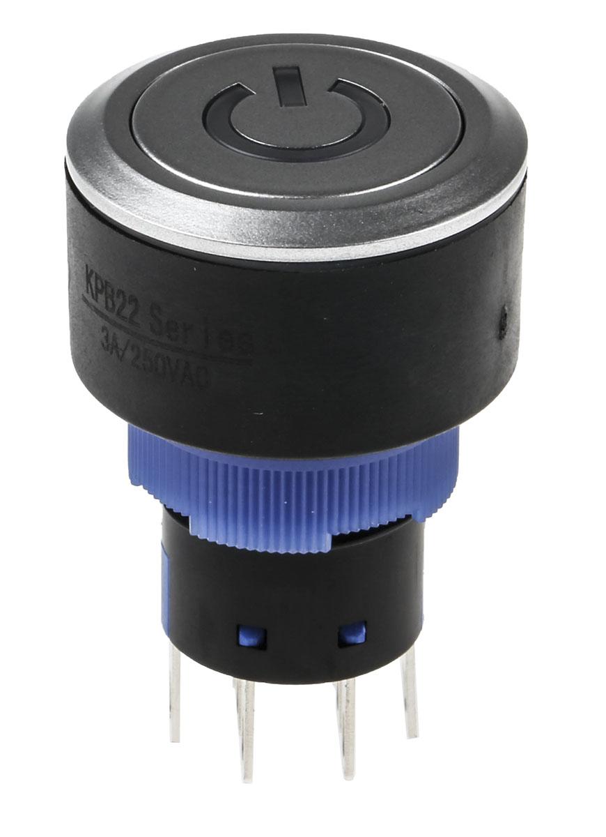 This is 2 Poles + Momentary + Green LED 24V manufactured by RS Pro. The manufacturer part number is 175-8395. It is designed with an adorable flat shape actuator . The actuator has an adorable silver colour. Illumination Option yes. The product is available in panel mount configuration. It is IP rated with ip65. The rated contact current is 3 a, 5 a. The panel has a 22.2mm cut-out diameter. Moreover, the product has a nominal 250v ac voltage rating. The LED has an adorable green colour. The casing is finished with an adorable silver colour. The product carries push button actuator. The contact is equipped with double pole double throw (dpdt) configuration. The terminal is a solder type. The panel cut out size includes 22.2 (dia.)mm. Its contact AC voltage rating is about 250v . Legend Information: power symbol. It provides momentary switch operation.