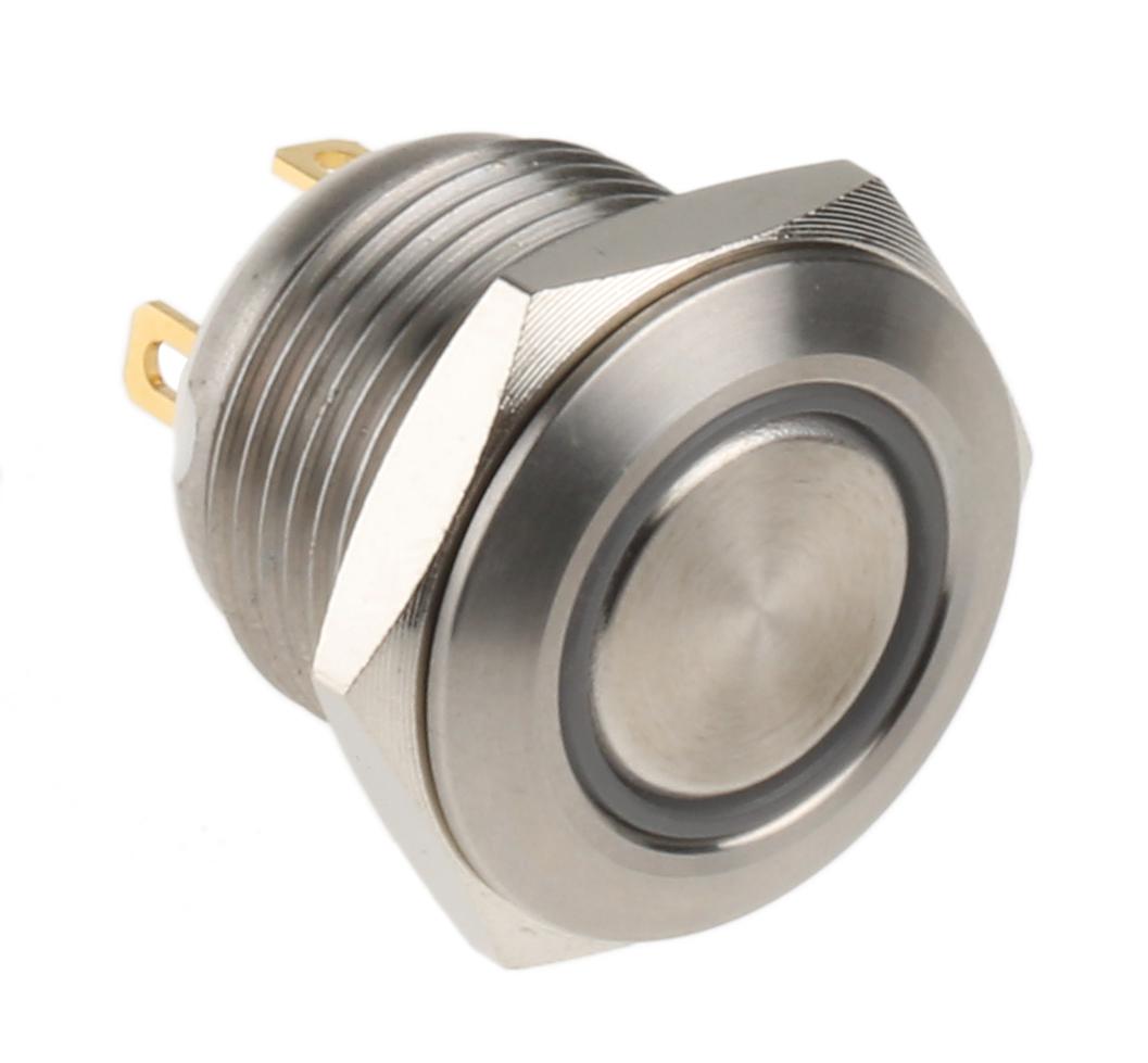 This is FLAT Push Button with Ring + Blue LED manufactured by RS Pro. The manufacturer part number is 175-9482. Illumination Option yes. The product is available in panel mount configuration. It is IP rated with ip67. The rated contact current is 2 a. The panel has a 16mm cut-out diameter. Moreover, the product has a nominal 36v dc voltage rating. It has about 36v contact DC voltage rating . This pushbutton has a flat style pushbutton and is easy to use. The LED has an adorable blue colour. The casing is finished with an adorable natural colour. While it has an adorable silver colour. The contact is equipped with spst configuration. The product has an assigned mpb16-a3fe-7-jr-0v manufacturer part number. It provides momentary switch operation. The terminal is a solder type. The product is made from sturdy silver alloy materials.