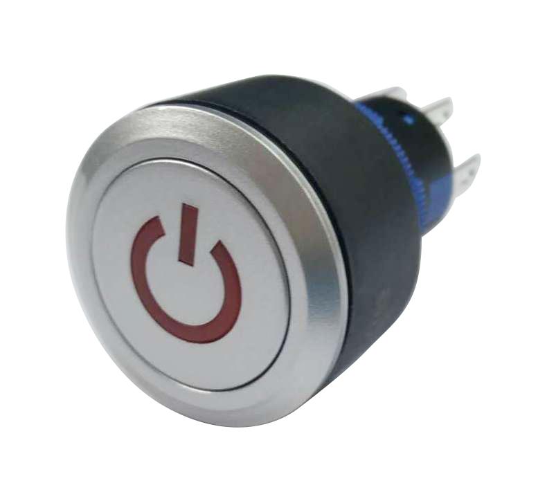 This is 2 Poles + Lock + Red LED 24V manufactured by RS Pro. The manufacturer part number is 175-9000. It is designed with an adorable flat shape actuator . The actuator has an adorable silver colour. Illumination Option yes. The product is available in panel mount configuration. It is IP rated with ip65. The rated contact current is 3 a, 5 a. The panel has a 22.2mm cut-out diameter. Moreover, the product has a nominal 250v ac voltage rating. The LED has an adorable red colour. The casing is finished with an adorable silver colour. The product carries push button actuator. The terminal is a solder type. The contact is equipped with double pole double throw (dpdt) configuration. Its contact AC voltage rating is about 250v . Legend Information: power symbol. The panel cut out size includes 22.2 (dia.)mm.