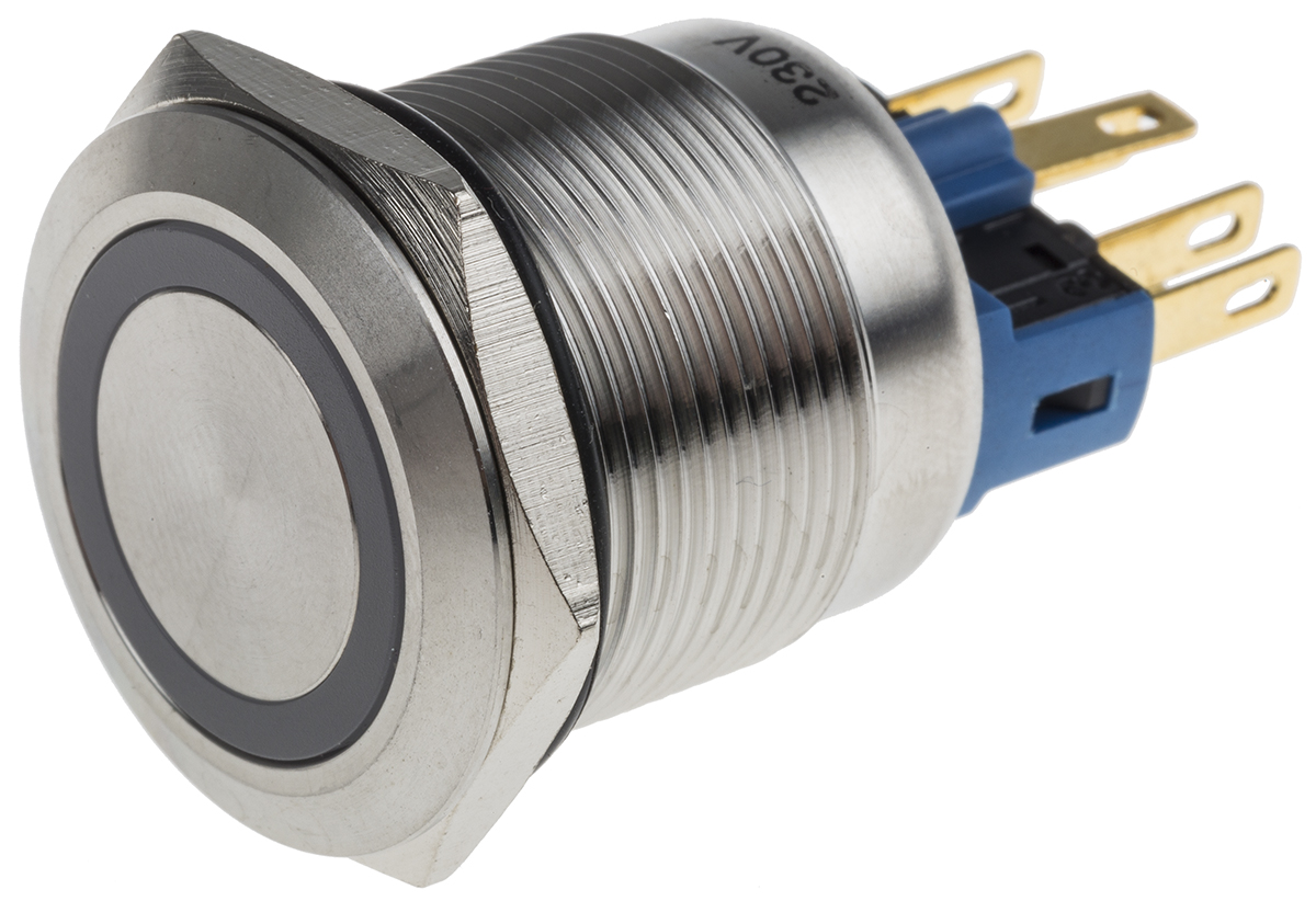 This is SPDT On-On Push Button Switch IP65 IP67 22 (Dia.)mm Panel Mount Blue LED 250V ac manufactured by RS Pro. The manufacturer part number is 811-8487. Illumination Option yes. The product is available in panel mount configuration. It is IP rated with ip65, ip67. The rated contact current is 5 a @ 250 v ac. The panel has a 22mm cut-out diameter. Moreover, the product has a nominal 250v ac voltage rating. This pushbutton has a round style pushbutton and is easy to use. The LED has an adorable blue colour. While it has an adorable silver colour. The contact is equipped with spdt configuration. It provides latching switch operation. Its contact AC voltage rating is about 250v . The terminal is a quick connect type. The product is made from sturdy silver alloy materials.