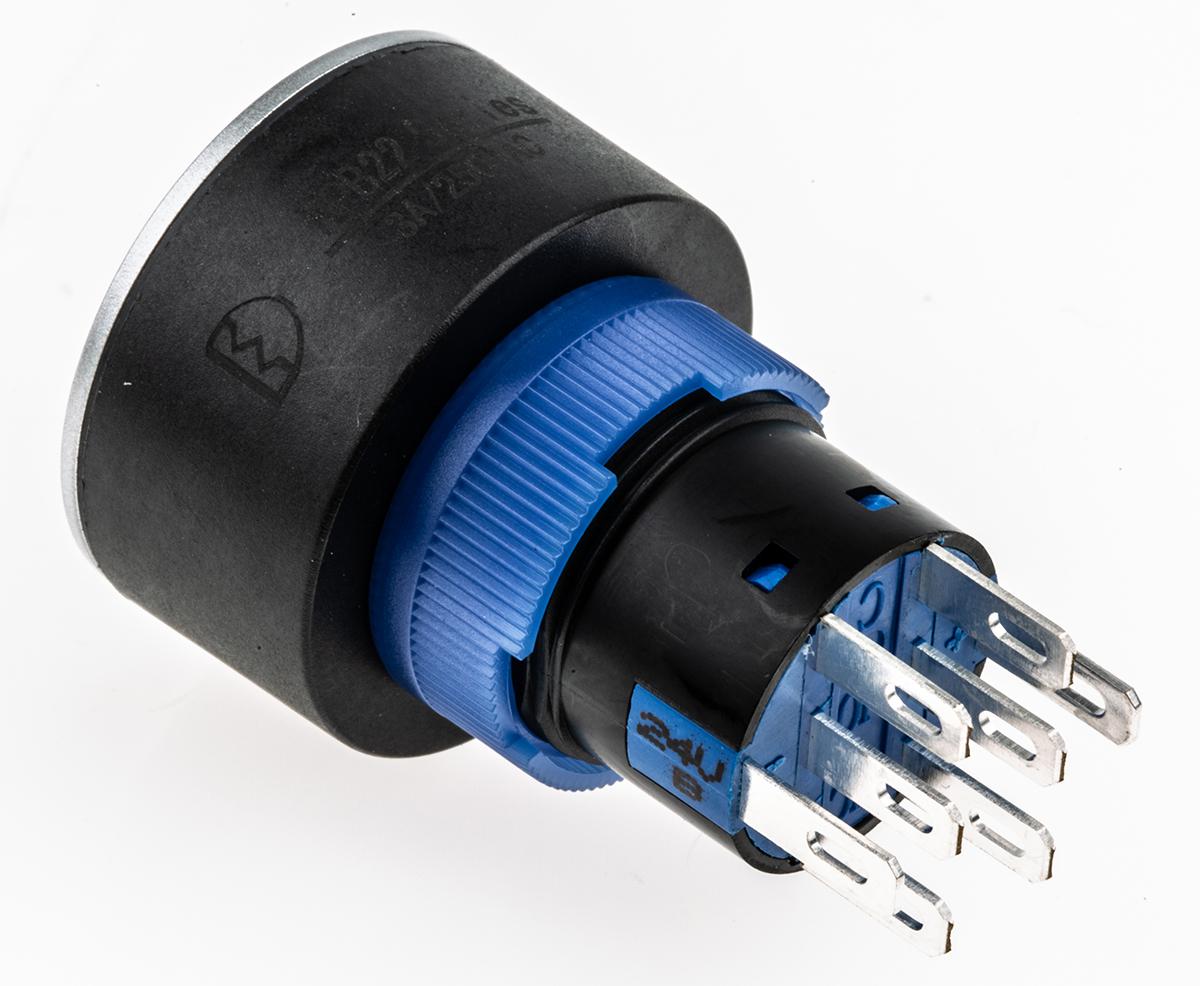 This is 2 Poles + Lock + Blue LED 24V manufactured by RS Pro. The manufacturer part number is 175-8309. Illumination Option yes. The product is available in panel mount configuration. It is IP rated with ip65. The rated contact current is 3 a, 5 a. The panel has a 22.2mm cut-out diameter. Moreover, the product has a nominal 250v ac voltage rating. This pushbutton has a flat style pushbutton and is easy to use. The LED has an adorable blue colour. The casing is finished with an adorable silver colour. While it has an adorable transparent colour. The product has an assigned kpb22-8000-f21-724-jq manufacturer part number. The contact is equipped with 2no/2nc configuration. Its contact AC voltage rating is about 250v . The terminal is a solder type. The product is made from sturdy brass materials.
