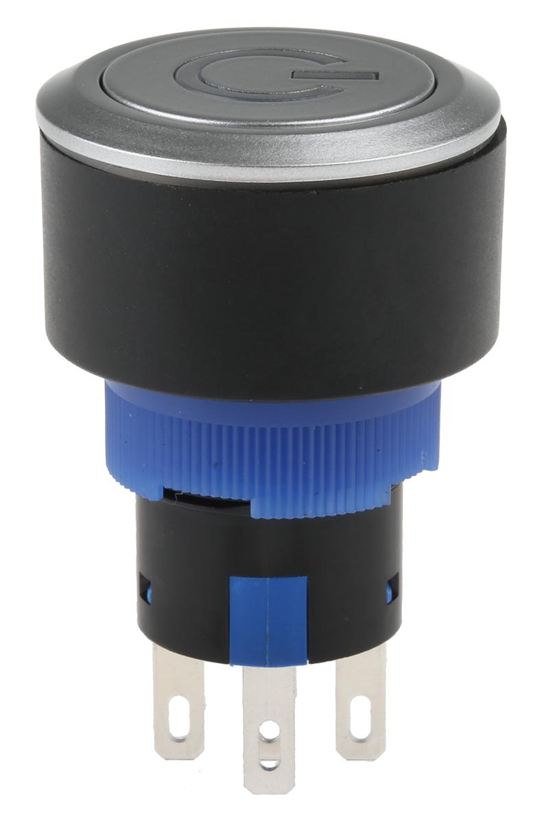 This is 1 Pole + Lock + Yellow LED 24V manufactured by RS Pro. The manufacturer part number is 175-8409. It is designed with an adorable flat shape actuator . The actuator has an adorable silver colour. Illumination Option yes. The product is available in panel mount configuration. It is IP rated with ip65. The rated contact current is 3 a, 5 a. The panel has a 22.2mm cut-out diameter. Moreover, the product has a nominal 250v ac voltage rating. The LED has an adorable yellow colour. The casing is finished with an adorable silver colour. The product carries push button actuator. The terminal is a solder type. The contact is equipped with single pole double throw (spdt) configuration. Its contact AC voltage rating is about 250v . Legend Information: power symbol. The panel cut out size includes 22.2 (dia.)mm.