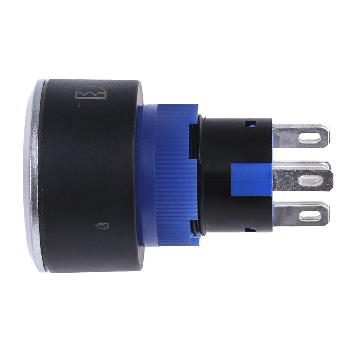 This is 2 Poles + Lock + Blue LED 220V manufactured by RS Pro. The manufacturer part number is 175-8352. Illumination Option yes. The product is available in panel mount configuration. It is IP rated with ip65. The rated contact current is 3 a, 5 a. The panel has a 22.2mm cut-out diameter. Moreover, the product has a nominal 250v ac voltage rating. This pushbutton has a flat style pushbutton and is easy to use. The LED has an adorable blue colour. The casing is finished with an adorable silver colour. While it has an adorable silver colour. The terminal is a solder type. The product has an assigned kpb22-88p7-f21-7220-jq manufacturer part number. The contact is equipped with dpdt configuration. Its contact AC voltage rating is about 250v . Legend Information: power symbol. The product is made from sturdy brass materials.