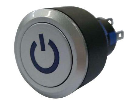 This is 2 Poles + Momentary + Blue LED 220V manufactured by RS Pro. The manufacturer part number is 175-8354. It is designed with an adorable flat shape actuator . The actuator has an adorable silver colour. Illumination Option yes. The product is available in panel mount configuration. It is IP rated with ip65. The rated contact current is 3 a, 5 a. The panel has a 22.2mm cut-out diameter. Moreover, the product has a nominal 250v ac voltage rating. The LED has an adorable blue colour. The casing is finished with an adorable silver colour. The product carries push button actuator. The contact is equipped with double pole double throw (dpdt) configuration. The terminal is a solder type. The panel cut out size includes 22.2 (dia.)mm. Its contact AC voltage rating is about 250v . Legend Information: power symbol. It provides momentary switch operation.