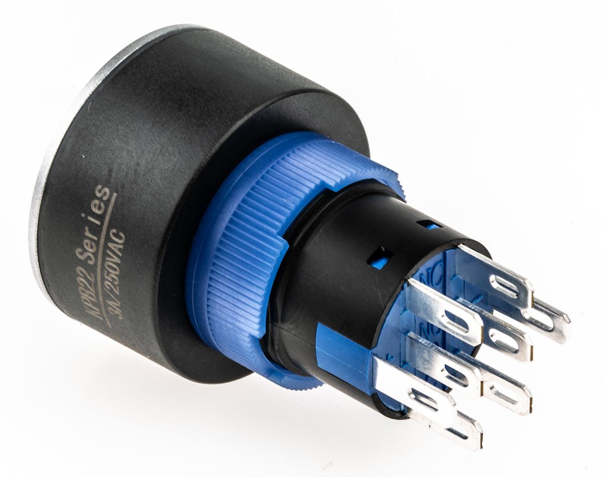 This is 2NO/2NC Lock Push Button Switch IP65 22.2 Dia.mm Panel Mount Red LED Power Symbol 250V ac manufactured by RS Pro. The manufacturer part number is 175-8389. Illumination Option yes. The product is available in panel mount configuration. It is IP rated with ip65. The rated contact current is 3 a, 5 a. The panel has a 22.2mm cut-out diameter. Moreover, the product has a nominal 250v ac voltage rating. This pushbutton has a flat style pushbutton and is easy to use. The LED has an adorable red colour. The casing is finished with an adorable silver colour. While it has an adorable silver colour. The terminal is a solder type. The product has an assigned kpb22-88p1-f21-3220-jq manufacturer part number. The contact is equipped with dpdt configuration. Its contact AC voltage rating is about 250v . Legend Information: power symbol. The product is made from sturdy brass materials.