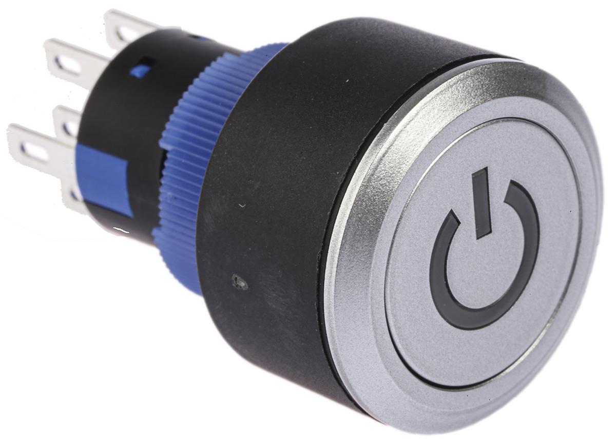 This is 2NO/2NC Lock Push Button Switch IP65 22.2 Dia.mm Panel Mount Red LED Power Symbol 250V ac manufactured by RS Pro. The manufacturer part number is 175-9048. It is designed with an adorable flat shape actuator . The actuator has an adorable silver colour. Illumination Option yes. The product is available in panel mount configuration. It is IP rated with ip65. The rated contact current is 3 a, 5 a. The panel has a 22.2mm cut-out diameter. Moreover, the product has a nominal 250v ac voltage rating. The LED has an adorable red colour. The casing is finished with an adorable silver colour. The product carries push button actuator. The terminal is a solder type. The contact is equipped with double pole double throw (dpdt) configuration. Its contact AC voltage rating is about 250v . Legend Information: power symbol. The panel cut out size includes 22.2 (dia.)mm.