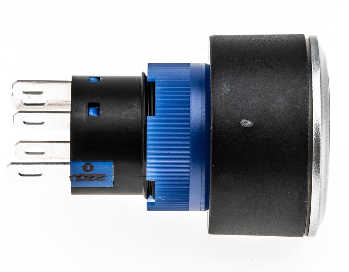 This is Single Pole Double Throw (SPDT) Lock Push Button Switch IP65 22.2 Dia.mm Panel Mount Green LED Power Symbol manufactured by RS Pro. The manufacturer part number is 175-8408. Illumination Option yes. The product is available in panel mount configuration. It is IP rated with ip65. The rated contact current is 3 a, 5 a. The panel has a 22.2mm cut-out diameter. Moreover, the product has a nominal 250v ac voltage rating. This pushbutton has a flat style pushbutton and is easy to use. The LED has an adorable green colour. The casing is finished with an adorable silver colour. While it has an adorable silver colour. The terminal is a solder type. The product has an assigned kpb22-88p1-f11-6220-jq manufacturer part number. The contact is equipped with spdt configuration. Its contact AC voltage rating is about 250v . Legend Information: power symbol. The product is made from sturdy brass materials.
