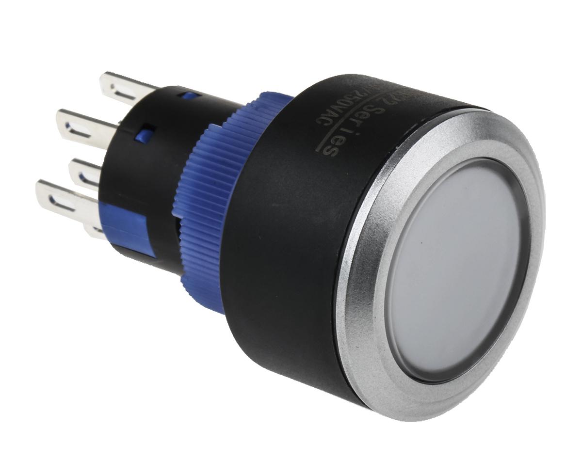 This is 2NO/2NC Momentary Push Button Switch IP65 22.2 Dia.mm Panel Mount Blue LED 250V ac manufactured by RS Pro. The manufacturer part number is 175-9042. Illumination Option yes. The product is available in panel mount configuration. It is IP rated with ip65. The rated contact current is 3 a, 5 a. The panel has a 22.2mm cut-out diameter. Moreover, the product has a nominal 250v ac voltage rating. This pushbutton has a flat style pushbutton and is easy to use. The LED has an adorable blue colour. The casing is finished with an adorable silver colour. While it has an adorable transparent colour. The contact is equipped with dpdt configuration. The product has an assigned kpb22-8000-f20-7220-jq manufacturer part number. It provides momentary switch operation. Its contact AC voltage rating is about 250v . The terminal is a solder type. The product is made from sturdy brass materials.