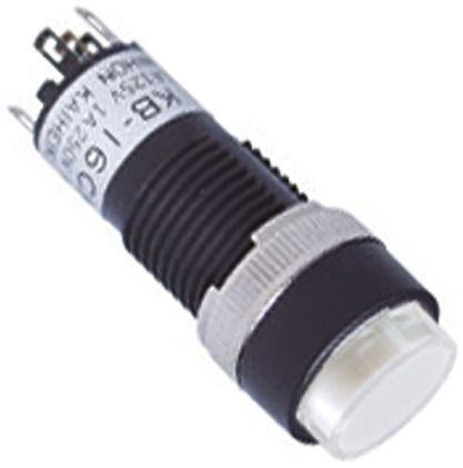 This is SPDT On-On Push Button Switch 12.3mm Panel Mount manufactured by NKK Switches. The manufacturer part number is KB-16CKS1-59WGNS. It is designed with an adorable round shape actuator . The actuator has an adorable white colour. Illumination Option yes. The product is available in panel mount configuration. The rated contact current is 1 a @ 250 v ac, 1 a @ 30 v dc. The panel has a 12.3mm cut-out diameter. The contact is equipped with single pole double throw (spdt) configuration. The LED has an adorable white colour. The casing is finished with an adorable black colour. The product carries button actuator. The panel cut out size includes 12.3 (dia.)mm. The terminal is a solder type. It provides latching switch operation.