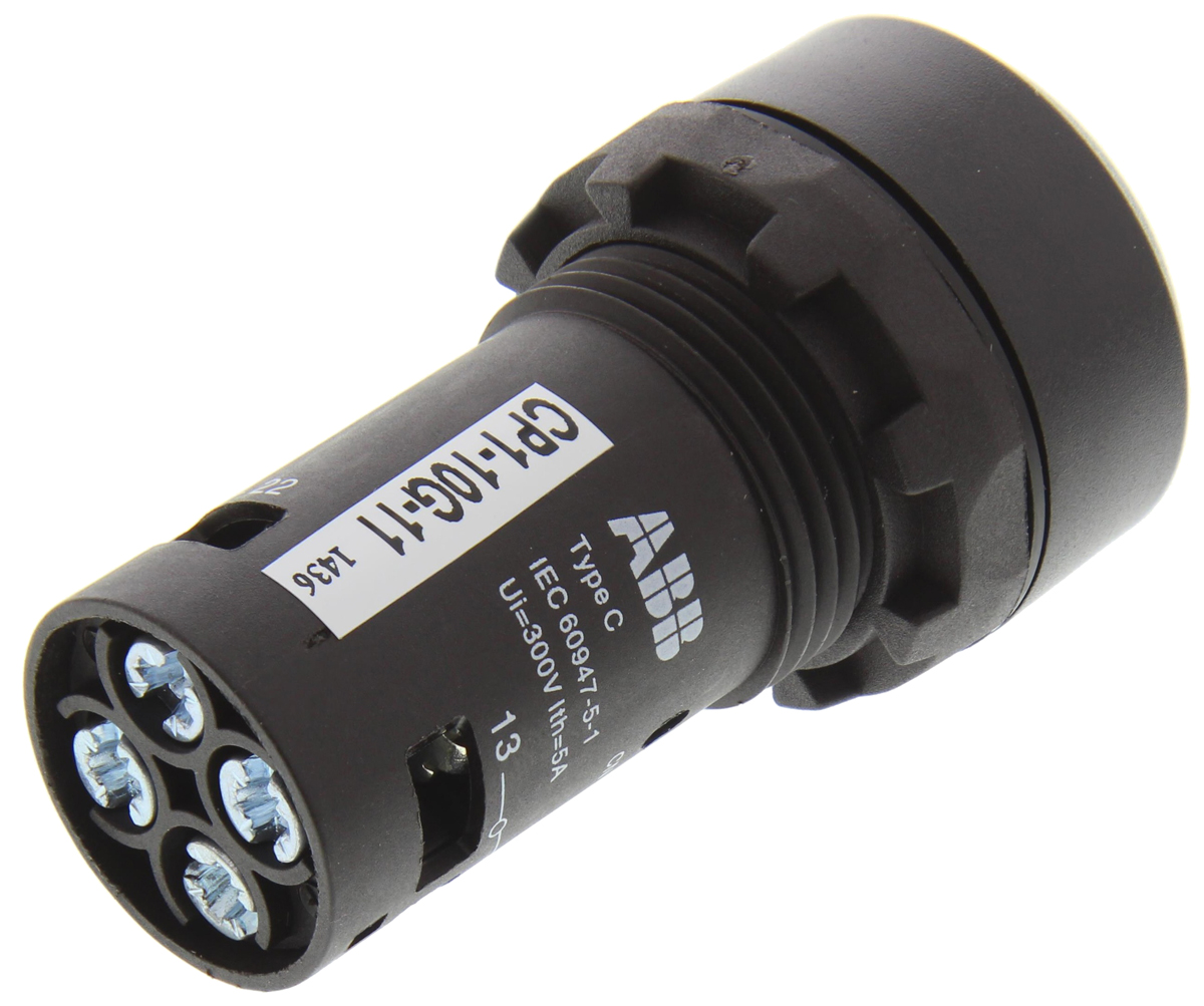 This is Compact Non-illuminated Green Round NO/NC 22mm Momentary Screw manufactured by ABB. The manufacturer part number is 1SFA619100R1072 CP1-10G-11. It has 250v maximum DC voltage. A bespoke product carries 240v of maximum AC voltage. Illumination Option no. The product is available in panel mount configuration. It is IP rated with ip69k. Whereas, the minimum operating temperature of the product is -25°c. The product compact, is a highly preferred choice for users. Moreover, the product has a nominal 300v voltage rating. This pushbutton has a round style pushbutton and is easy to use. Pushbutton is manufactured from highly rugged and reliable pc material. The casing is finished with an adorable black colour. While it has an adorable green colour. The panel has a 22mm cut-out diameter. The product has an assigned 1sfa619100r1072 cp1-10g-11 manufacturer part number. The contact is equipped with spdt configuration. It has a maximum operating temperature of +70°c. The terminal is a screw type. It provides momentary switch operation.