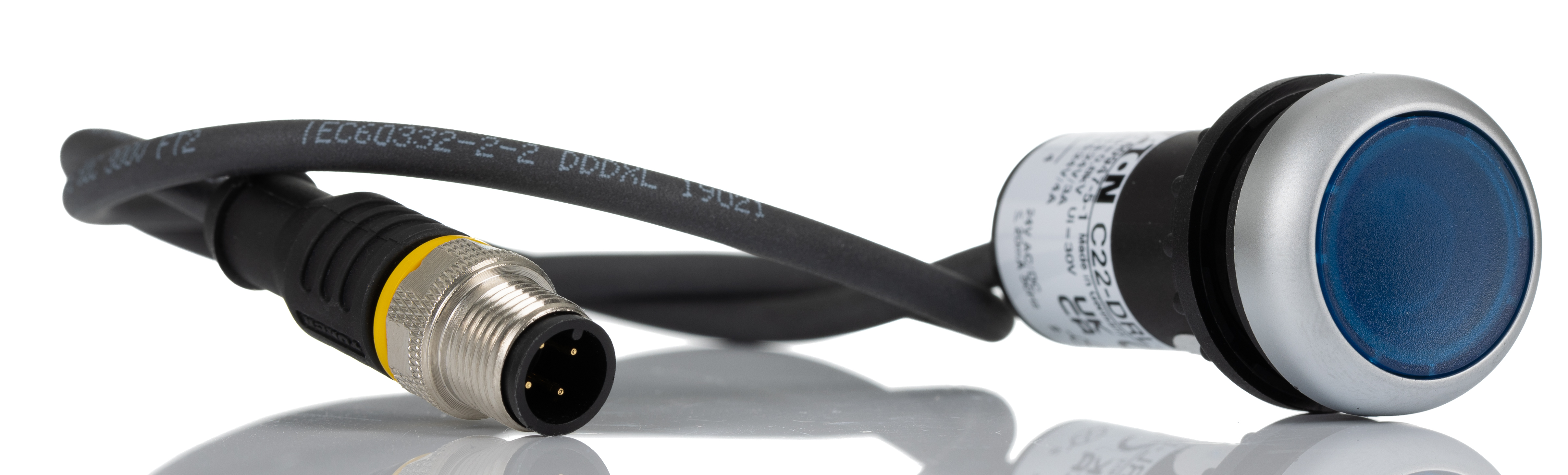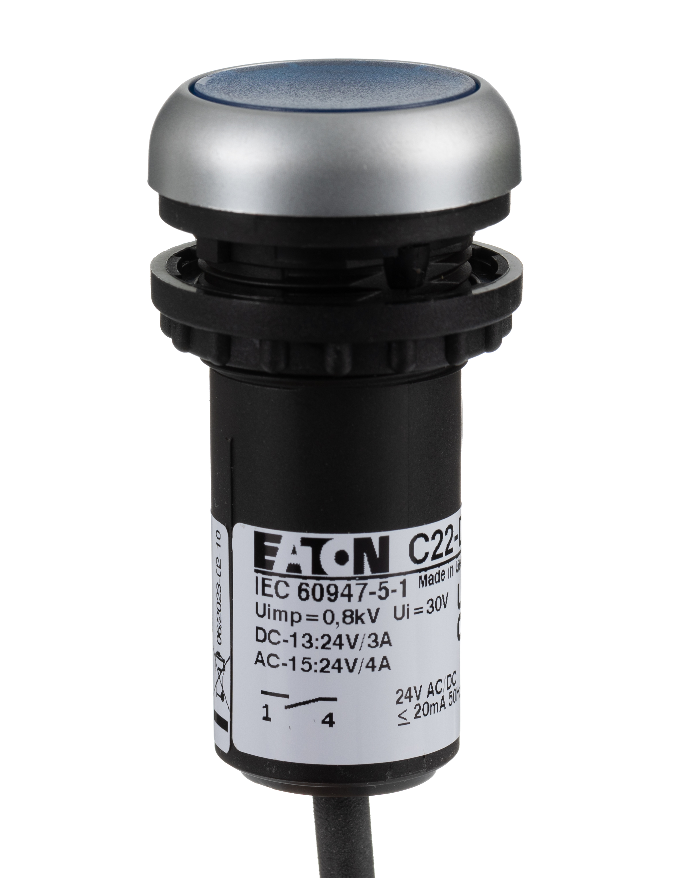 This is C22 Illuminated Blue Flat Push Button NO 22mm Maintained manufactured by Eaton. The manufacturer part number is 181628 C22-DRL-B-K10-24-P3. It has 220v maximum DC voltage. A bespoke product carries 230v of maximum AC voltage. Illumination Option yes. The product is available in panel mount configuration. It is IP rated with ip67, ip69k. The product c22, is a highly preferred choice for users. The product has - 25 → +70°c of operating temperature range. This pushbutton has a round style pushbutton and is easy to use. Pushbutton is manufactured from highly rugged and reliable plastic material. The product's body is nicely designed from plastic materials. While it has an adorable blue colour. The panel has a 22mm cut-out diameter. The product has an assigned 181628 c22-drl-b-k10-24-p3 manufacturer part number. The contact is equipped with spst configuration. It has a maximum operating temperature of +70°c. Whereas, the minimum operating temperature of the product is -25°c. In addition, the push button diameter of the product is about 29.7mm .