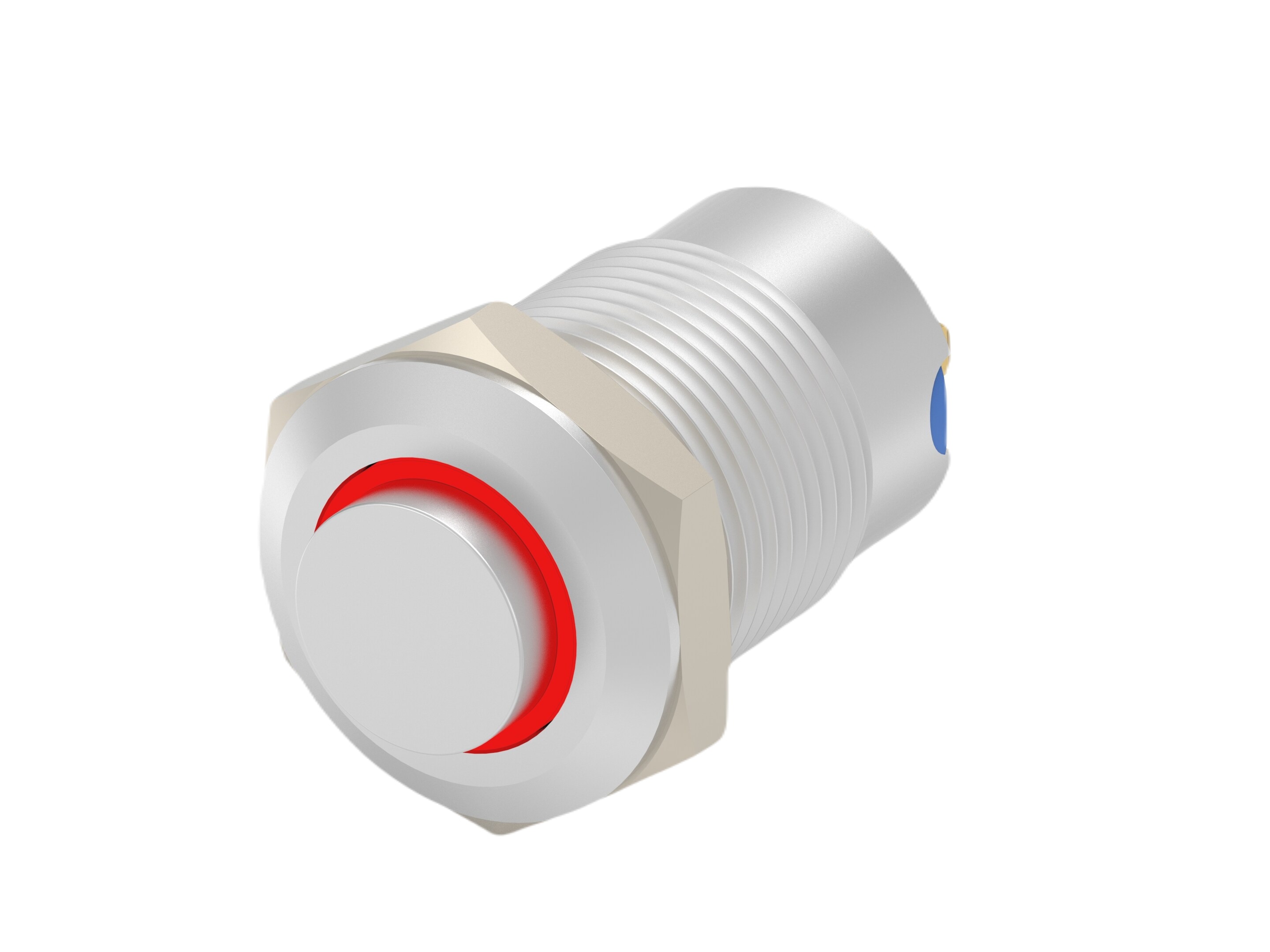 This is AV12 Series Illuminated Push Button Switch Momentary Threaded 9mm Cutout SPST Red LED 12V IP67 manufactured by TE Connectivity. The manufacturer part number is AV1210E312R04. It provides momentary switch operation. Illumination Option yes. It is IP rated with ip67. The product av12, is a highly preferred choice for users. The contact is equipped with spst configuration. It is created with a/an 2p switch configuration . The LED has an adorable red colour. Its accurate length is 20mm. Whereas, the minimum operating temperature of the product is -20°c. The terminal is a threaded connector type. push button switch is a versatile product designed to provide user-defined applications. It has a maximum operating temperature of 55°c. Legend Information: power logo, ring, spot. It has a threaded type mount .