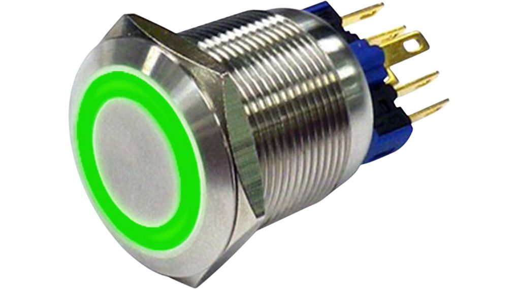 This is 210 Series Illuminated Vandal Proof Push Button Switch On-(On) Panel Mount 22mm Cutout 1NC 1NO Green LED manufactured by RND. The manufacturer part number is RND 210-00404. Illumination Option yes. The product is available in panel mount configuration. It is IP rated with ip65. The product rnd 210, is a highly preferred choice for users. Moreover, the product has a nominal 250v ac voltage rating. The LED has an adorable green colour. While it has an adorable silver colour. The panel has a 22mm cut-out diameter. The product has an assigned rnd 210-00404 manufacturer part number. The contact is equipped with 1nc, 1no configuration. It provides on-(on) switch operation.