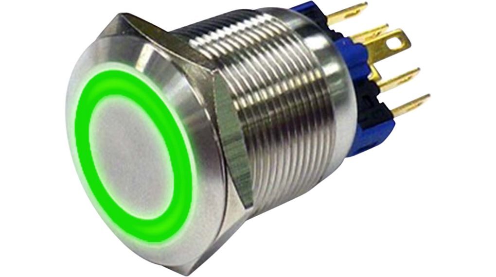 This is 210 Series Illuminated Vandal Proof Push Button Switch Latching Panel Mount 19mm Cutout 1NC 1NO Green manufactured by RND. The manufacturer part number is RND 210-00411. Illumination Option yes. The product is available in panel mount configuration. It is IP rated with ip65. The product rnd 210, is a highly preferred choice for users. Moreover, the product has a nominal 250v ac voltage rating. The LED has an adorable green colour. While it has an adorable silver colour. The panel has a 19mm cut-out diameter. The product has an assigned rnd 210-00411 manufacturer part number. The contact is equipped with 1nc, 1no configuration. It provides latching switch operation.