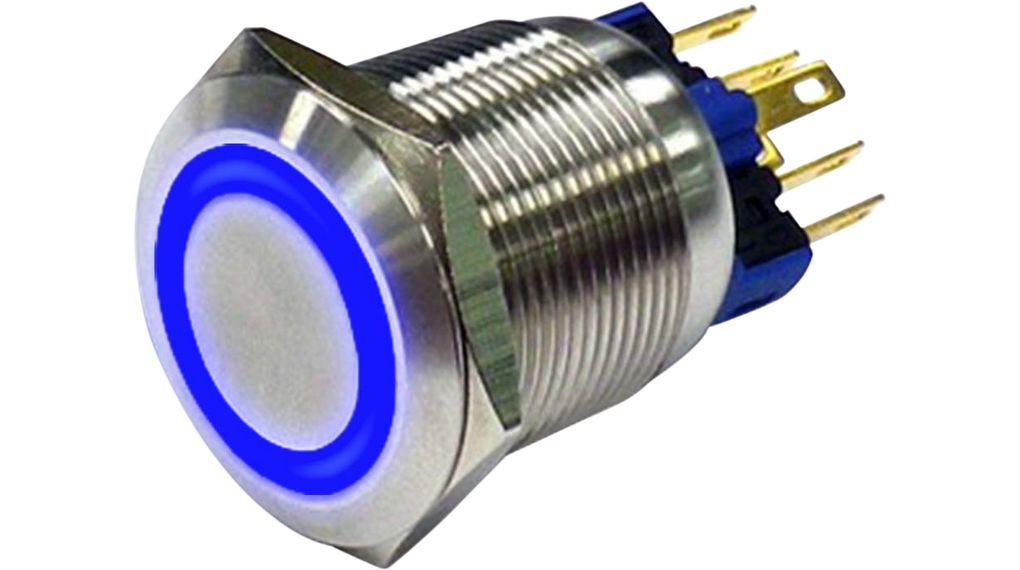 This is 210 Series Illuminated Vandal Proof Push Button Switch On-(On) Panel Mount 22mm Cutout 1NC 1NO Blue LED manufactured by RND. The manufacturer part number is RND 210-00405. Illumination Option yes. The product is available in panel mount configuration. It is IP rated with ip65. The product rnd 210, is a highly preferred choice for users. Moreover, the product has a nominal 250v ac voltage rating. The LED has an adorable blue colour. While it has an adorable silver colour. The panel has a 22mm cut-out diameter. The product has an assigned rnd 210-00405 manufacturer part number. The contact is equipped with 1nc, 1no configuration. It provides on-(on) switch operation.