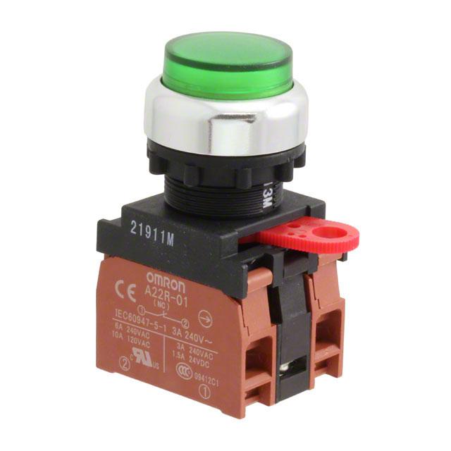 This is manufactured by Omron Automation and Safety. The manufacturer part number is A22RL-TG-24A-02M. It is assigned with possible HTSUS value of 8536.50.9035. The product exhibits 120 v of AC voltage rating. The product offers long-lasting services of 500,000 cycles. Moreover, it has screw terminal terminal style. The product has -20°c ~ 50°c operating temperature range. It also has a circular - 22.30mm dia dimensional features. The product also provide mechanical stability with 3,000,000 cycles. It comes in standard, illuminated configuration. It is supplied with led, green illumination. It is shipped in bulk package . It is designed as a on-mom switching function. Its typical moisture sensitivity level is 1 (unlimited). The actuator marking of the product corelates with no marking. It has an integral dpst-nc circuit. Additionally, the product's output is 10a (ac). It is IP rated with ip65 - dust tight, water resistant. The product is available in panel mount, front configuration. The product a22rl, is a highly preferred choice for users. It is made from green. The product carries round, button actuator. The nominal illumination voltage of the product is 24 vac/dc. The product is designated with the ear99 code number.