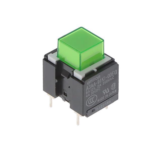 This is manufactured by Omron Automation and Safety. The manufacturer part number is A3AA-91K1-00EG. It is assigned with possible HTSUS value of 8536.50.9035. The product is rohs compliant. The product offers long-lasting services of 50,000 cycles. Moreover, it has pc pin terminal style. 30 v of DC voltage rating. The product has -10°c ~ 55°c operating temperature range. The product also provide mechanical stability with 1,000,000 cycles. It comes in standard, illuminated configuration. It is made from green. The product exhibits 125 v of AC voltage rating. It is supplied with led, green illumination. It is designed as a off-mom switching function. Its typical moisture sensitivity level is 1 (unlimited). The actuator marking of the product corelates with no marking. It has an integral spst-no circuit. It has a long 13 weeks standard lead time. Additionally, the product's output is 6a (ac), 4a (dc). It is IP rated with ip00. The product is available in through hole configuration. The product a3a, is a highly preferred choice for users. In addition, bulk is the available packaging type of the product. The product carries square, button actuator. The nominal illumination voltage of the product is 2.1 vdc. Moreover, it corresponds to a3aa-91k, a base product number of the product. The product is designated with the ear99 code number.