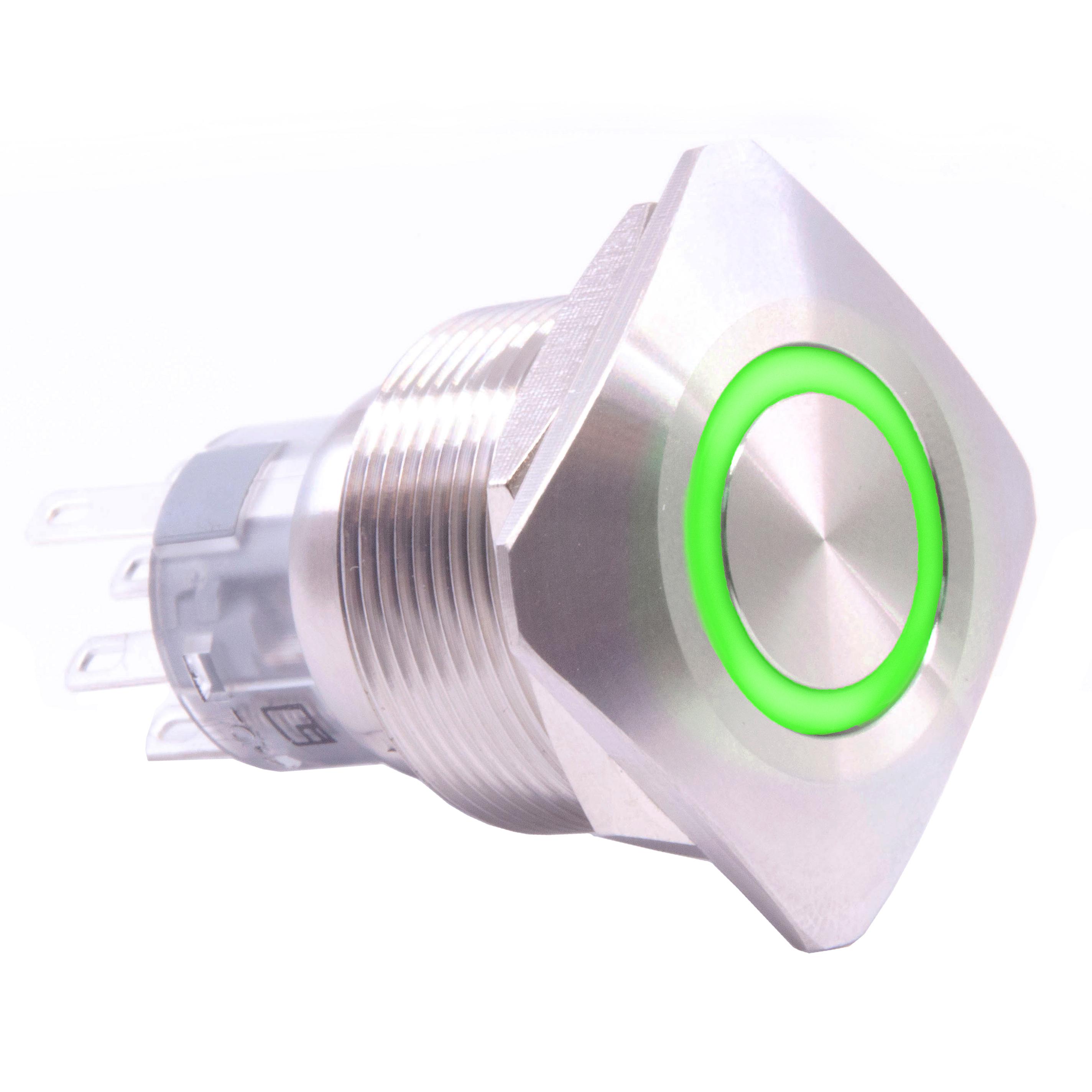 This is manufactured by E-Switch. The manufacturer part number is PVS7F2BSS335. It is assigned with possible HTSUS value of 8536.50.9031. The product is rohs3 compliant. The product offers long-lasting services of 50,000 cycles. Moreover, it has solder, quick connect - 0.110" (2.8mm) terminal style. 24 v of DC voltage rating. The product has -20°c ~ 55°c operating temperature range. It also has a circular - 22.00mm dia dimensional features. It comes in anti-vandal, illuminated configuration. In addition, it is reach unaffected. It is supplied with led, green illumination. It is shipped in bulk package . It is designed as a on-mom switching function. Its typical moisture sensitivity level is 1 (unlimited). The actuator marking of the product corelates with no marking. It has an integral spdt circuit. It has a long 13 weeks standard lead time. Additionally, the product's output is 2a (dc). It is IP rated with ip65 - dust tight, water resistant. The product is available in panel mount, front configuration. The product pvs7, is a highly preferred choice for users. It is made from silver. The product carries round, button, flush actuator. The nominal illumination voltage of the product is 24 vdc. Moreover, it corresponds to pvs7, a base product number of the product. The product is designated with the ear99 code number.