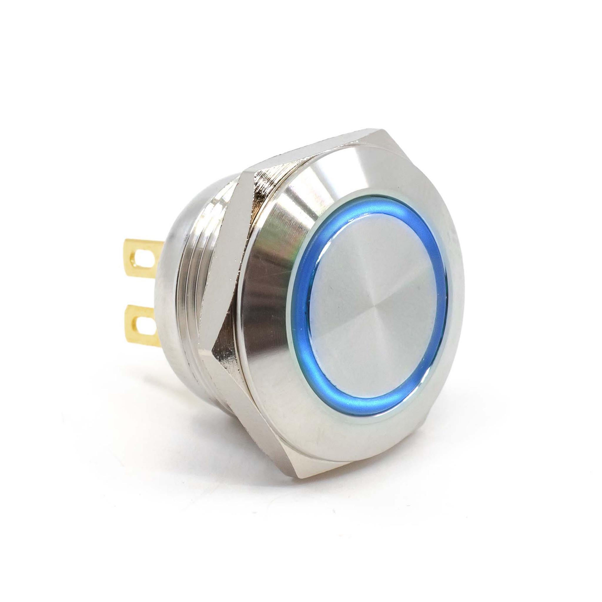This is manufactured by E-Switch. The manufacturer part number is PVT4FS4SS345. It is assigned with possible HTSUS value of 8536.50.9031. The product is rohs3 compliant. The product offers long-lasting services of 500,000 cycles. Moreover, it has solder lug terminal style. 24 v of DC voltage rating. The product has -25°c ~ 55°c operating temperature range. It also has a circular - 19.00mm dia dimensional features. It comes in anti-vandal, illuminated configuration. It is supplied with led, blue illumination. It is shipped in tray package . It is designed as a off-mom switching function. Its typical moisture sensitivity level is 1 (unlimited). It has an integral spst-no circuit. It has a long 13 weeks standard lead time. Additionally, the product's output is 50ma (dc). It is IP rated with ip65 - dust tight, water resistant. The product is available in panel mount, front configuration. The product pvt4, is a highly preferred choice for users. It is made from silver. The product carries round, button, flush actuator. The nominal illumination voltage of the product is 24 vdc. The product is designated with the ear99 code number.
