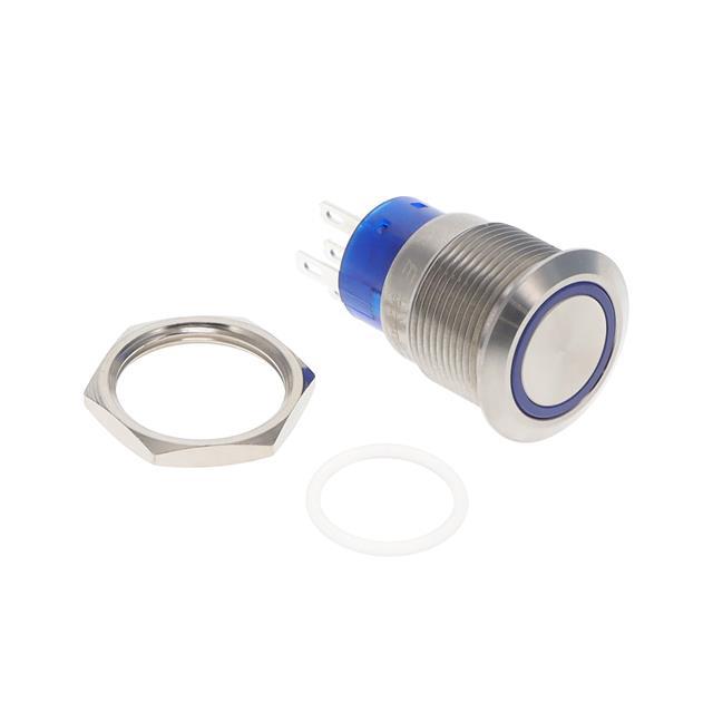 This is manufactured by E-Switch. The manufacturer part number is ULV4F23SS344. It is assigned with possible HTSUS value of 8536.50.9033. The product is rohs3 compliant. The product offers long-lasting services of 50,000 cycles. Moreover, it has solder, quick connect - 0.110" (2.8mm) terminal style. The product has -20°c ~ 55°c operating temperature range. It also has a circular - 19.20mm dia dimensional features. The product also provide mechanical stability with 500,000 cycles. It comes in anti-vandal, illuminated configuration. The product exhibits 125 v of AC voltage rating. In addition, it is reach affected. It is supplied with led, blue illumination. It is designed as a on-on switching function. Its typical moisture sensitivity level is 1 (unlimited). It has an integral spdt circuit. It has a long 11 weeks standard lead time. Additionally, the product's output is 3a (ac). It is IP rated with ip67 - dust tight, waterproof. The product is available in panel mount, front configuration. The product ulv4, is a highly preferred choice for users. In addition, bulk is the available packaging type of the product. It is made from silver. The product carries round, button, flush actuator. The nominal illumination voltage of the product is 12 vdc. The product is designated with the ear99 code number.