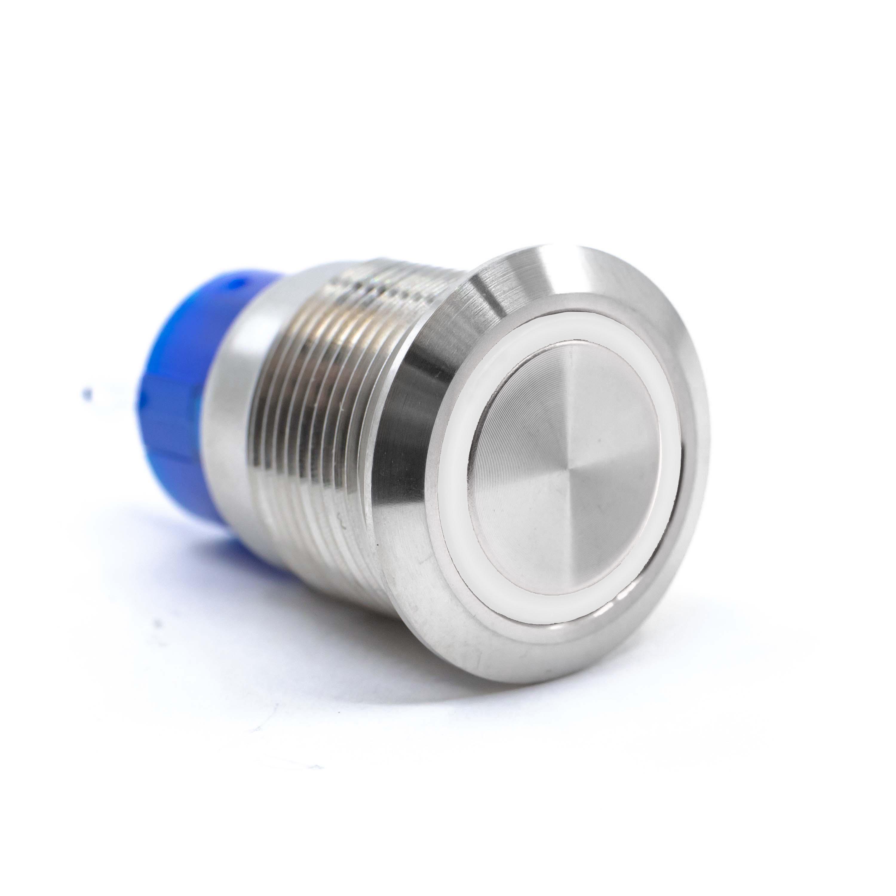This is manufactured by E-Switch. The manufacturer part number is ULV4F2BSS305. It is assigned with possible HTSUS value of 8536.50.9031. The product is rohs3 compliant. The product offers long-lasting services of 50,000 cycles. Moreover, it has solder, quick connect - 0.110" (2.8mm) terminal style. The product has -20°c ~ 55°c operating temperature range. It also has a circular - 19.20mm dia dimensional features. The product also provide mechanical stability with 1,000,000 cycles. It comes in anti-vandal, illuminated configuration. The product exhibits 125 v of AC voltage rating. It is supplied with led, white illumination. It is shipped in bulk package . It is designed as a on-mom switching function. Its typical moisture sensitivity level is 1 (unlimited). It has an integral spdt circuit. It has a long 12 weeks standard lead time. Additionally, the product's output is 3a (ac). It is IP rated with ip67 - dust tight, waterproof. The product is available in panel mount, front configuration. The product ulv4, is a highly preferred choice for users. It is made from silver. The product carries round, button, flush actuator. The nominal illumination voltage of the product is 24 vdc. The product is designated with the ear99 code number.