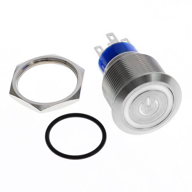 This is manufactured by E-Switch. The manufacturer part number is ULV7F2BSS605. It is assigned with possible HTSUS value of 8536.50.9031. The product is rohs3 compliant. Moreover, it has solder, quick connect - 0.110" (2.8mm) terminal style. The product has -20°c ~ 55°c operating temperature range. It also has a circular - 22.20mm dia dimensional features. It comes in anti-vandal, illuminated configuration. The product exhibits 125 v of AC voltage rating. It is supplied with led, white illumination. It is designed as a on-mom switching function. Its typical moisture sensitivity level is 1 (unlimited). It has an integral spdt circuit. It has a long 12 weeks standard lead time. Additionally, the product's output is 3a (ac). It is IP rated with ip67 - dust tight, waterproof. The product is available in panel mount, front configuration. The product ulv7, is a highly preferred choice for users. In addition, bulk is the available packaging type of the product. It is made from silver. The product carries round, button, flush actuator. The nominal illumination voltage of the product is 24 vdc. The product is designated with the ear99 code number.