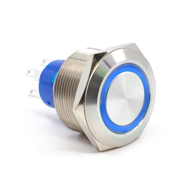 This is manufactured by E-Switch. The manufacturer part number is ULV8F2BSS343. It is assigned with possible HTSUS value of 8536.50.9031. The product is rohs3 compliant. The product offers long-lasting services of 50,000 cycles. Moreover, it has solder, quick connect - 0.110" (2.8mm) terminal style. The product has -20°c ~ 55°c operating temperature range. It also has a circular - 25.00mm dia dimensional features. The product also provide mechanical stability with 1,000,000 cycles. It comes in anti-vandal, illuminated configuration. The product exhibits 125 v of AC voltage rating. It is supplied with led, blue illumination. It is designed as a on-mom switching function. Its typical moisture sensitivity level is 1 (unlimited). It has an integral spdt circuit. It has a long 12 weeks standard lead time. Additionally, the product's output is 3a (ac). It is IP rated with ip67 - dust tight, waterproof. The product is available in panel mount, front configuration. The product ulv8, is a highly preferred choice for users. In addition, bulk is the available packaging type of the product. It is made from silver. The product carries round, button, flush actuator. The nominal illumination voltage of the product is 6 vdc. The product is designated with the ear99 code number.