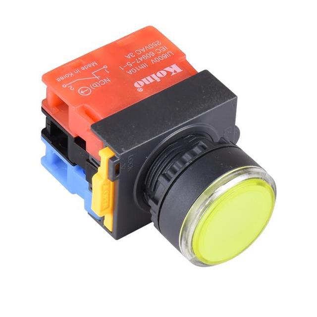 This is manufactured by KOINO. The manufacturer part number is NS22-BA-L1ALY1A1B. It is assigned with possible HTSUS value of 8536.50.2000. The product is rohs non-compliant. The product offers long-lasting services of 500,000 cycles. Moreover, it has screw terminal terminal style. 250 v of DC voltage rating. The product has -25°c ~ 70°c operating temperature range. It also has a circular - 22.30mm dia dimensional features. The product also provide mechanical stability with 1,000,000 cycles. It comes in standard, illuminated configuration. It is made from yellow. The product exhibits 250 v of AC voltage rating. In addition, it is vendor undefined. It is supplied with led, yellow illumination. It is designed as a on-off, off-on switching function. It has an integral dpst-no/nc circuit. Additionally, the product's output is 3a (ac), 270ma (dc). It is IP rated with ip65 - dust tight, water resistant. The product is available in panel mount, front configuration. The product ns22, is a highly preferred choice for users. In addition, bulk is the available packaging type of the product. The product carries round, button, flush actuator. The nominal illumination voltage of the product is 110 vac. The product is designated with the ear99 code number.