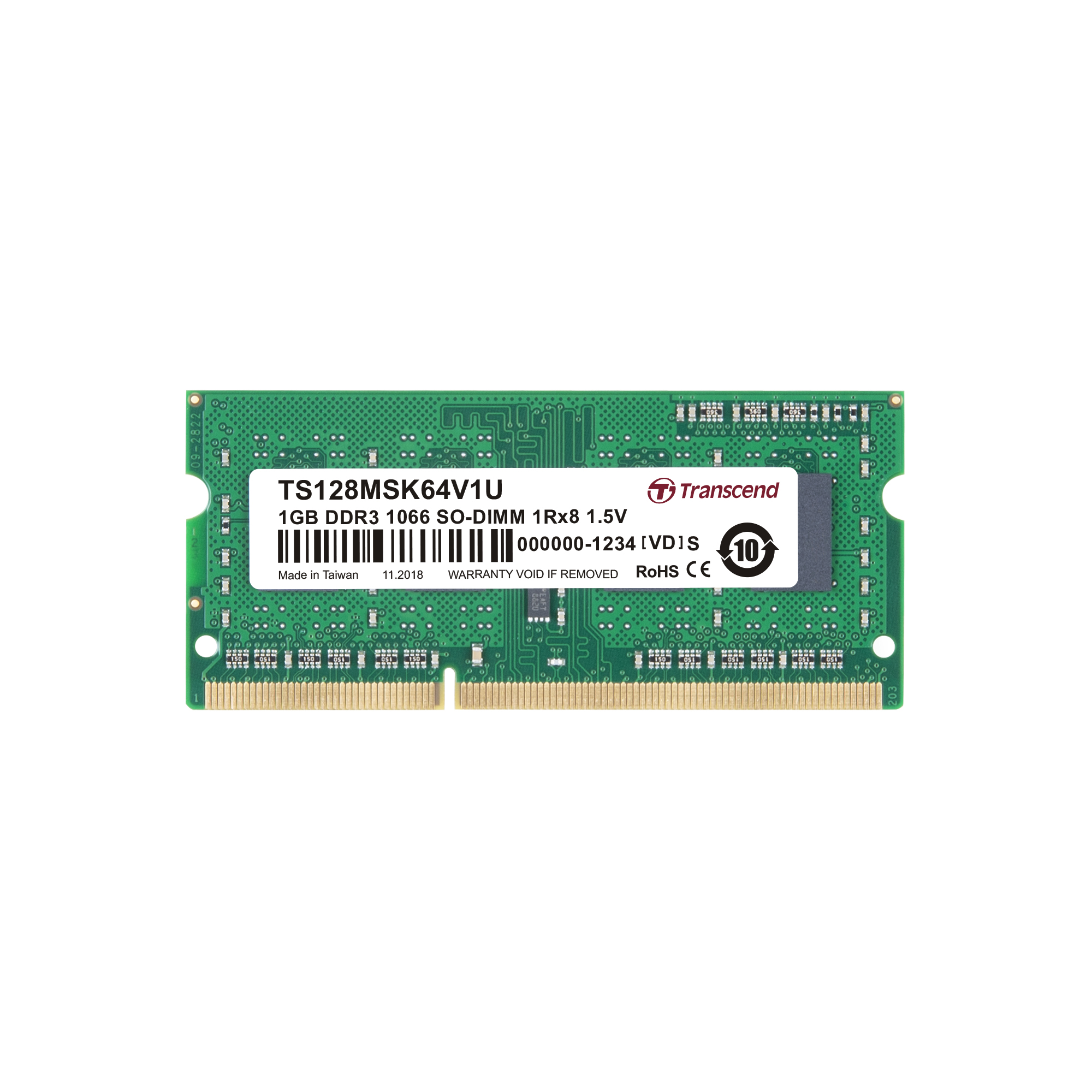 This is 1 GB DDR3 Desktop Laptop RAM 1066Mbit/s SODIMM 1.5V manufactured by Transcend. The manufacturer part number is TS128MSK64V1U. The module has the capacity of 1 gb. It includes a/an sodimm memory socket . Additionally, it has a standard ddr3 class memory . It is for a desktop, laptop . It carries a 1.5v of voltage. It has a robust speed of 1066mbit/s.