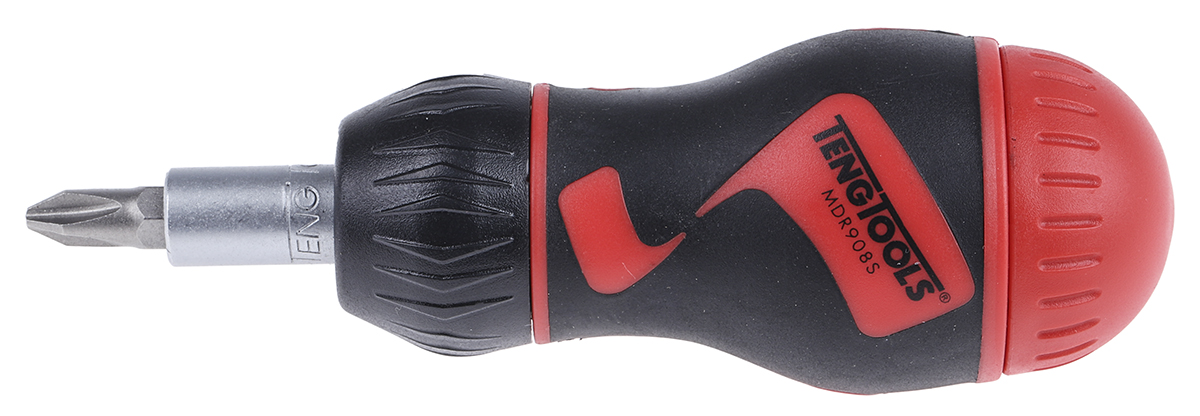 This is 1/4 in Hexagon Hexagon Ratchet Screwdriver 100 mm length manufactured by Teng Tools. The manufacturer part number is MDR908S. The tip is ph1, ph2, pz1, pz2, sl5, sl7 in size. The product features a hexagon drive. The blade has a length of 40 mm. It has an overall length of 100 mm. The product has a drive size of 1/4 in. The built-in exquisite tip is a hexagon tip. The product consists of 8 pieces.