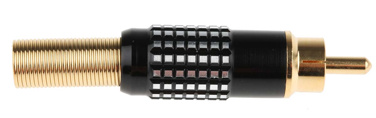 This is Black Cable Mount RCA Plug manufactured by RS Pro. The manufacturer part number is 106-975. The product is available in cable mount configuration. In addition, male is the available "Gender" of the product. It has a decent black colour. The product also features robust aluminium housing material. It allows solder termination method. The product is made from sturdy brass materials.