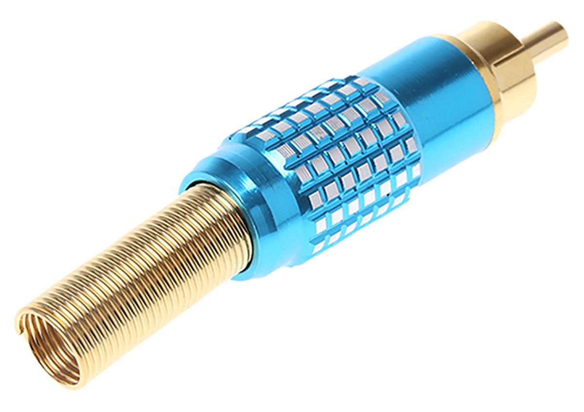 This is Blue Cable Mount RCA Plug manufactured by RS Pro. The manufacturer part number is 106-947. The product is available in cable mount configuration. In addition, male is the available "Gender" of the product. It has a decent blue colour. The product also features robust aluminium housing material. It allows solder termination method. The product is made from sturdy brass materials.