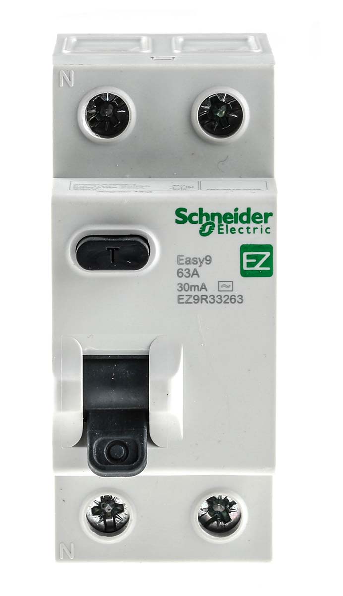 This is 2 Pole Type AC Residual Current Circuit Breaker 63A EZ9 30mA manufactured by Schneider Electric. The manufacturer part number is EZ9R33263. The product has type ac earth leakage protection type . Better World Verification Options - green premium. Is it a better world product? yes. The product has a current rating of 63a. Moreover, the product has a nominal 230v ac voltage rating. Allows up to 30ma trip sensitivity. The product ez9, is a highly preferred choice for users. It has an overall width of 36mm. This is a type of rccb, a circuit breaker with unique features. Furthermore, the product has an overall dimensions of 36 x 82 x 72mm. It allows type ac tripping features. The product is available in din rail mount style. It features easy9 range. The product has a rated AC voltage of 230v. The terminal contact is kind of tunnel terminal. Similarly, the product has 72mm of overall depth. It has equipped with 2 poles.