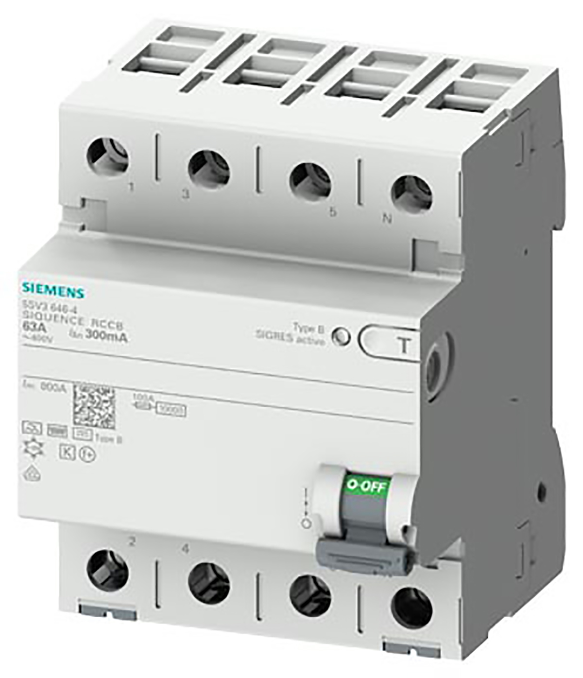 This is RCCB 4-pole Type B 63 A 30 mA Un AC 400V manufactured by Siemens. The manufacturer part number is 5SV3346-4. Is it a better world product? yes. This is a type of rccb, a circuit breaker with unique features. The product 5sv3, is a highly preferred choice for users. It has an overall width of 72mm. Furthermore, the product has an overall dimensions of 72 x 77 x 90mm. It allows type b tripping features. The product is available in din rail mount style. The product has a rated AC voltage of 400v. It has an overall length of 90mm. Similarly, the product has 77mm of overall depth. It has equipped with 3p+n poles. It is a toggle switch reset actuator.
