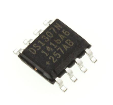 This is Real Time Clock (RTC) 56B RAM Serial-I2C 8-Pin SOIC manufactured by Maxim. The manufacturer part number is DS1307ZN+. Included functions calendar . It has about 56b user RAM . The product is available in surface mount configuration. Whereas, the minimum operating temperature of the product is -40 °c. While its minimum operating supply voltage is 4.5 v. Date Format Info: dw:dm:m:y. In addition, the height is 1.5mm. Furthermore, the product is 4mm wide. Its accurate length is 5mm. The package is a sort of soic. It includes a serial-i2c type bus . Assigned with a time format of hh:mm:ss . It has 5.5 v maximum operating supply voltage. It has a maximum operating temperature of +85 °c. It contains 8 pins. The given dimensions of the product include 5 x 4 x 1.5mm.