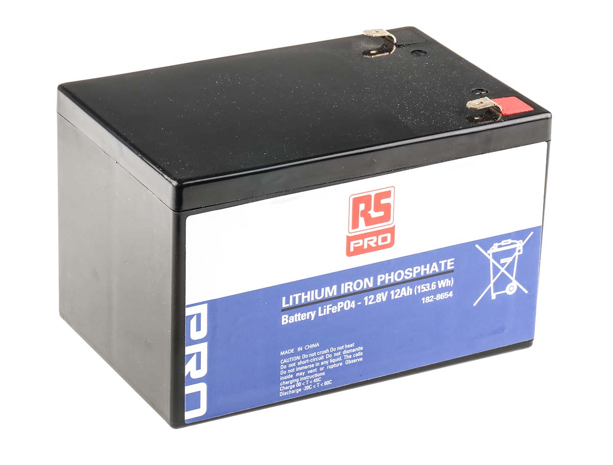 This is Lithium iron phosphate battery UN38.3 (1 manufactured by RS PRO. The manufacturer part number is 182-8654. The module has the capacity of 12ah. The product has +20 → +60°c of operating temperature range. The number of supplied batteries is/are 1 . The nominal voltage of the product is 12.8v. It has a/an lithium iron phosphate chemistry . The terminal is a t2 type. Its brand range is rs pro .
