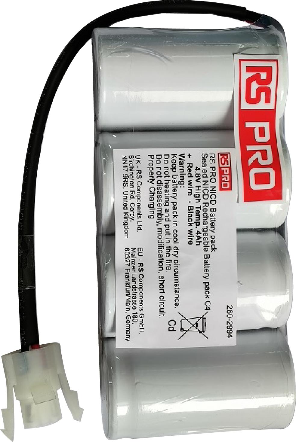 This is 4.8V NiCd Rechargeable Battery Pack 4Ah manufactured by RS PRO. The manufacturer part number is 260-2994. The module has the capacity of 4ah. It is comprised of 4 cells. Whereas, the minimum operating temperature of the product is -5°c. The nominal voltage of the product is 4.8v. It has a/an nicd chemistry . It has a maximum operating temperature of 55°c. The terminal is a wire lead type.