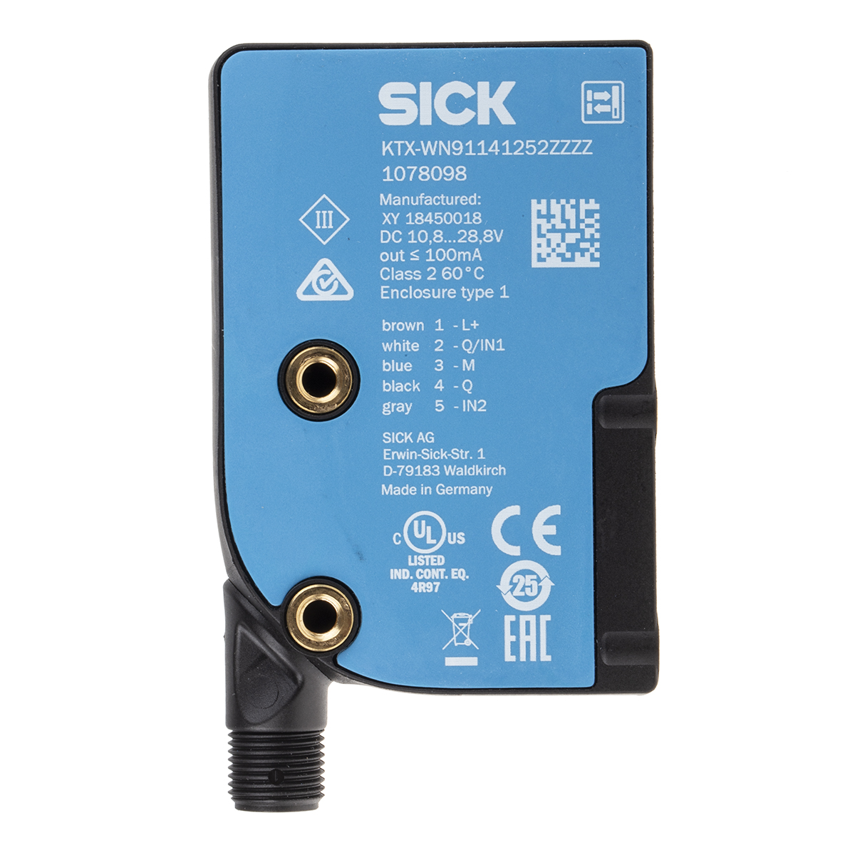 This is KTX Contrast Sensor manufactured by Sick. The manufacturer part number is KTX-WN91141252ZZZZZZZZZZZZZZZ1. The product has 13 mm of detection range. It has provided with m12 male connector electrical connection. It also carries 100 ma maximum current. The product is available in panel mount configuration. It is IP rated with ip67. The product ktx, is a highly preferred choice for users. The product includes an LED status display yes . Furthermore, it has anpn output. The product also features robust vistal housing material. Features 10.8 → 28.8 v dc supply voltage. Whereas, the minimum operating temperature of the product is -20°c. It exhibits a typical 50 khz switching frequency . It has a maximum operating temperature of +60°c. The terminal is a m12 male 5-pin connector type. Uses rgb led as a light source.