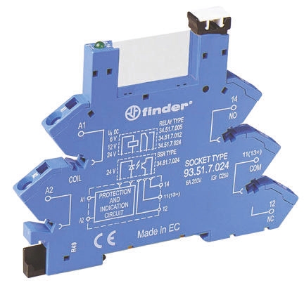This is Relay Socket for use with 34.51 34.81 250V ac manufactured by Finder. The manufacturer part number is 93.51.0.125. The product has a current rating of 10a. The product is available in din rail configuration. The product 93, is a highly preferred choice for users. It is a type of socket accessory. It carries a 250v ac of voltage. The product is highly suitable for 34.51, 34.81. The product contains 5 contacts.
