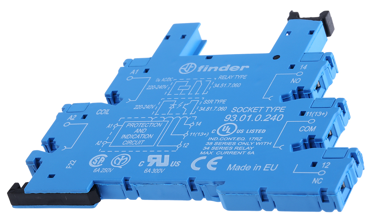 This is 5 pin Relay Socket 250V ac for use with 34.51 34.81 manufactured by Finder. The manufacturer part number is 93.01.0.240. The product has a current rating of 10a. The product is available in din rail configuration. The product 93, is a highly preferred choice for users. It carries a 250v ac of voltage. The product is highly suitable for 34.51, 34.81. The product contains 5 contacts.