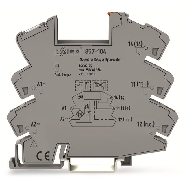 This is manufactured by WAGO Corporation. The manufacturer part number is 857-104. It is assigned with possible HTSUS value of 8536.90.4000. The product is rohs3 compliant. Moreover, it has spring terminal terminal style. In addition, it is reach affected. Its typical moisture sensitivity level is not applicable. In addition, box is the available packaging type of the product. The product is suitable for use with 857 series. The product is available in din rail configuration. It has a long 12 weeks standard lead time. The wago corporation's product offers user-desired applications. It comes in socket configuration. The product is designated with the ear99 code number.