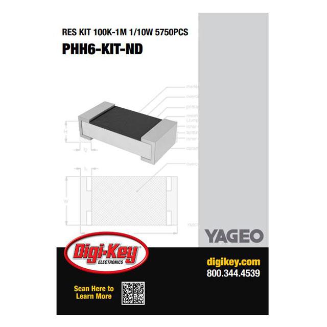 This is manufactured by Yageo. The manufacturer part number is PHH6-KIT. It is assigned with possible HTSUS value of 8533.21.0030. The product is rohs3 compliant. The product features power and watts of 1/10w. It features ±1% of tolerance value. Moreover, the given resistance of the product is 100k ~ 1m. In addition, it is reach unaffected. It is shipped in bag package . Its typical moisture sensitivity level is 1 (unlimited). It also includes 0603 (1608 metric) packages. Available in 5750 pieces (115 values - 50 each) quantity. The thick film is designed to provide robust applications in a variety of specific settings. The splendid features of the product include moisture resistant. The product is available in surface mount configuration. The product rc_l, is a highly preferred choice for users. The product is designated with the ear99 code number.