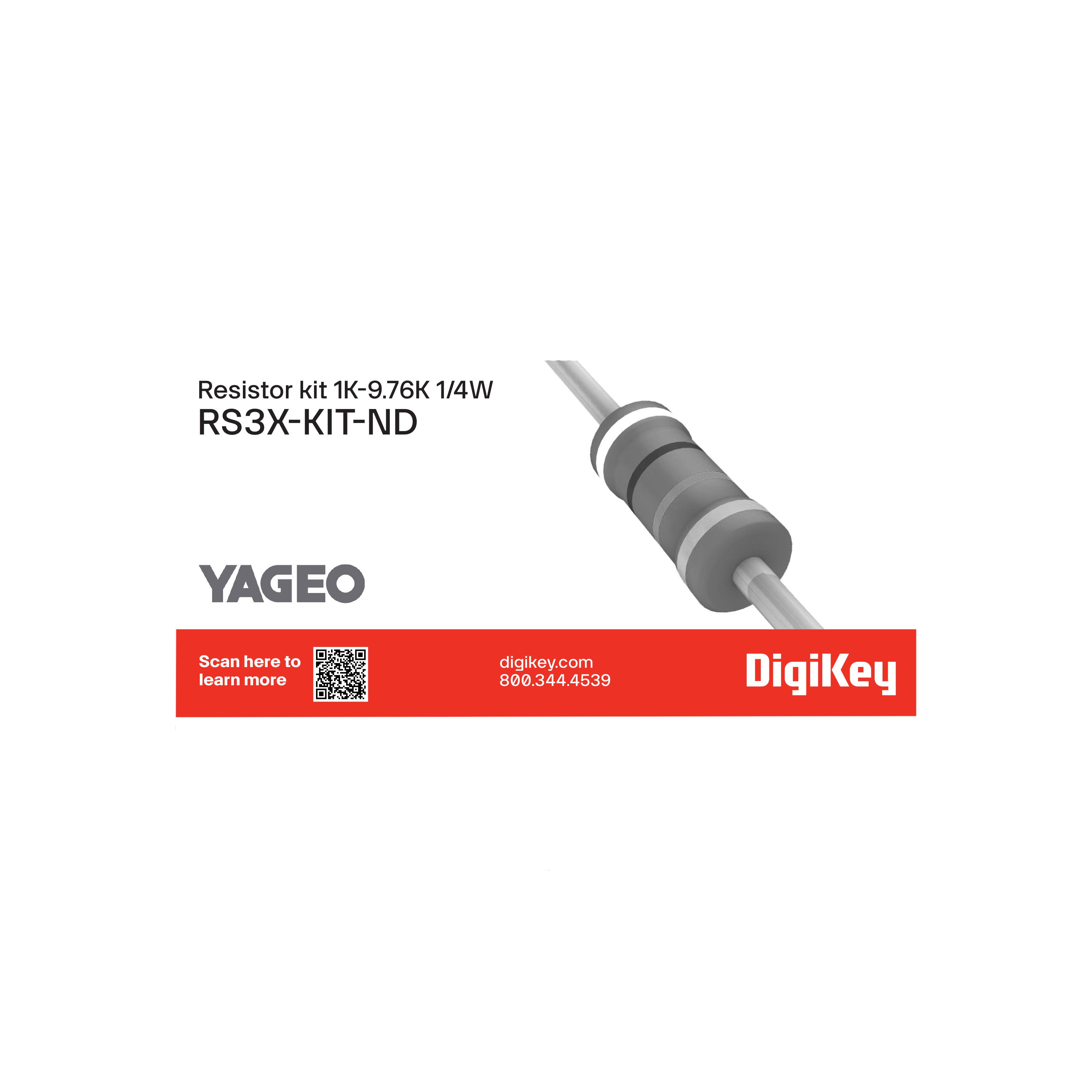 This is manufactured by Yageo. The manufacturer part number is RS3X. It is assigned with possible HTSUS value of 8533.21.0090. The product is rohs3 compliant. The product features power and watts of 1/4w. It features ±1% of tolerance value. Moreover, the given resistance of the product is 1k ~ 9.76k. In addition, it is reach unaffected. The yageo's product offers user-desired applications. Its typical moisture sensitivity level is 1 (unlimited). It also includes axial packages. Available in 480 pieces (96 values - 5 each) quantity. The metal film is designed to provide robust applications in a variety of specific settings. The product is available in through hole configuration. The product mfr, is a highly preferred choice for users. In addition, bag is the available packaging type of the product. The product is designated with the ear99 code number.