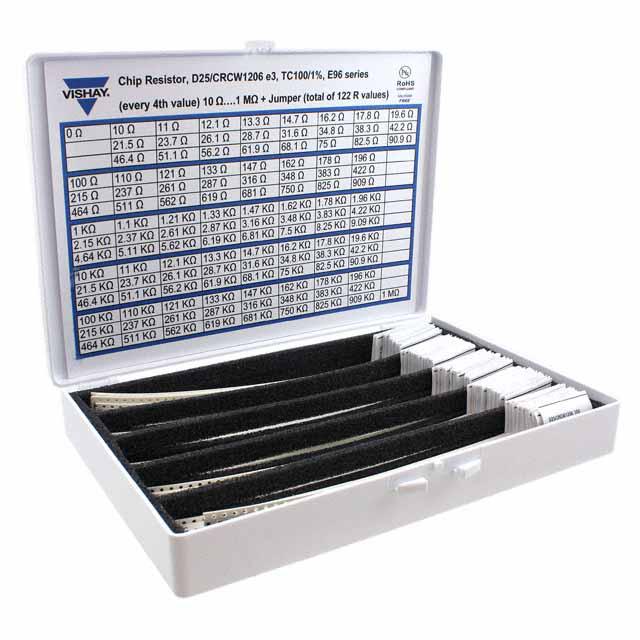 This is manufactured by Vishay Dale. The manufacturer part number is LAE1DCHIP1206KFE96. It is assigned with possible HTSUS value of 8533.21.0030. The product is rohs3 compliant. The product features power and watts of 1/4w. It features jumper, ±1% of tolerance value. Moreover, the given resistance of the product is 0.0 ~ 1m. In addition, it is reach unaffected. It is shipped in box package . Its typical moisture sensitivity level is 1 (unlimited). It also includes 1206 (3216 metric) packages. Available in 6100 pieces (122 values - 50 each) quantity. The thick film is designed to provide robust applications in a variety of specific settings. The splendid features of the product include automotive aec-q200. The product is available in surface mount configuration. The product crcw, is a highly preferred choice for users. The product is designated with the ear99 code number.