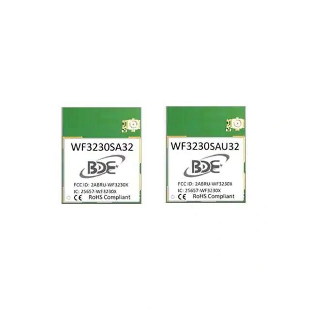 This is manufactured by BDE Technology. The manufacturer part number is BDE-WF3230SA32. It is assigned with possible HTSUS value of 8517.62.0090. The product is rohs compliant. The product has -40°c ~ 85°c (ta) operating temperature range. It holds a typical memory size of 4mb flash, 256kb ram. Moreover, the product comes in 63-smd module. It carries 223ma transmission current. The current receiving of the product is 59ma. Features dsss, ofdm modulation. In addition, it is reach unaffected. It has a maximised data speed rate of 72mbps. It is shipped in tape & reel (tr) package . Its typical moisture sensitivity level is 3 (168 hours). The standard RF Family of the product includes wifi. The product features a 802.11b/g/n protocol. Additionally, [Utilised IC / Part] is the used part of the product. The product is available in surface mount configuration. It is a integrated, chip antenna. The sensitivity given includes -96dbm. It features adc, gpio, i²c, i²s, jtag, spi, pwm, uart serial interface. Supplied with 2.4ghz of frequency. It has optimum voltage supply of 2.3v ~ 3.6v. The product has an output power 18dbm.