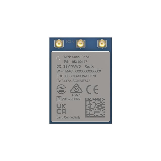 This is manufactured by Laird Connectivity Inc.. The manufacturer part number is 453-00117R. It is assigned with possible HTSUS value of 8517.62.0090. The product has -40°c ~ 85°c operating temperature range. It holds a typical memory size of 2mb rom, 512kb sram. Moreover, the product comes in 108-flga module. Features 4-dqpsk, 8-dpsk, 16-qam, 64-qam, 256-qam, 1024-qam, bpsk, cck, dsss, fhss, gfsk, ofdm, qpsk modulation. It has a maximised data speed rate of 1.2gbps. It is shipped in tape & reel (tr) package . Its typical moisture sensitivity level is 4 (72 hours). The standard RF Family of the product includes bluetooth, wifi. It has a long 21 weeks standard lead time. The product features a 802.11a/b/g/n/ac/ax, bluetooth v5.4 protocol. Additionally, [Utilised IC / Part] is the used part of the product. The product is available in surface mount configuration. It is a integrated, chip, mhf4 antenna. The product sona™, is a highly preferred choice for users. The sensitivity given includes -107dbm. It features pcie, sdio, uart serial interface. Supplied with 2.41ghz ~ 7.13ghz of frequency. It has optimum voltage supply of 1.71v ~ 1.89v, 3.13v ~ 3.47v. The product has an output power 19.5dbm. The product is designated with the 5a992c 24 code number.