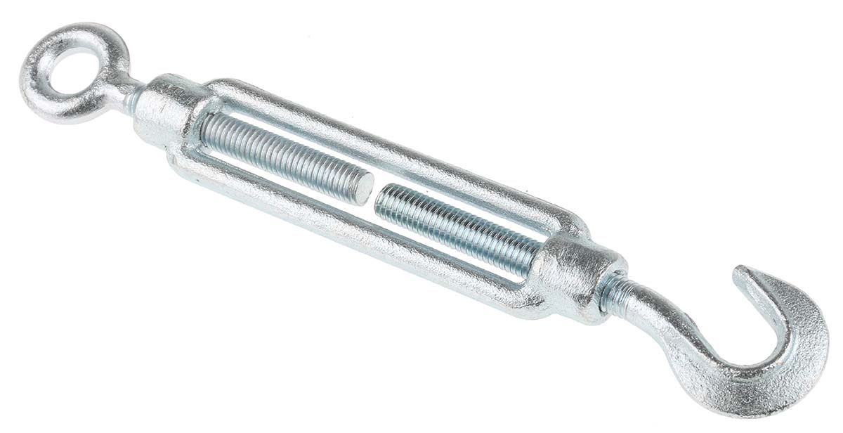This is Rigging Screw Hook to Eye M8 manufactured by RS Pro. The manufacturer part number is 674-011. A quality product with a nice electro galvanised finish. The typical product's weight is 126g. Moreover, it has approximately 264mm open length . It has about 184mm closed length . The product is made from highly stable and reliable steel. It has a 10mm eye diameter . It has a typical thread size of m8. It has a/an hook to eye end fittings . Moreover, the end A fitting is hook . With an end B fitting of eye .