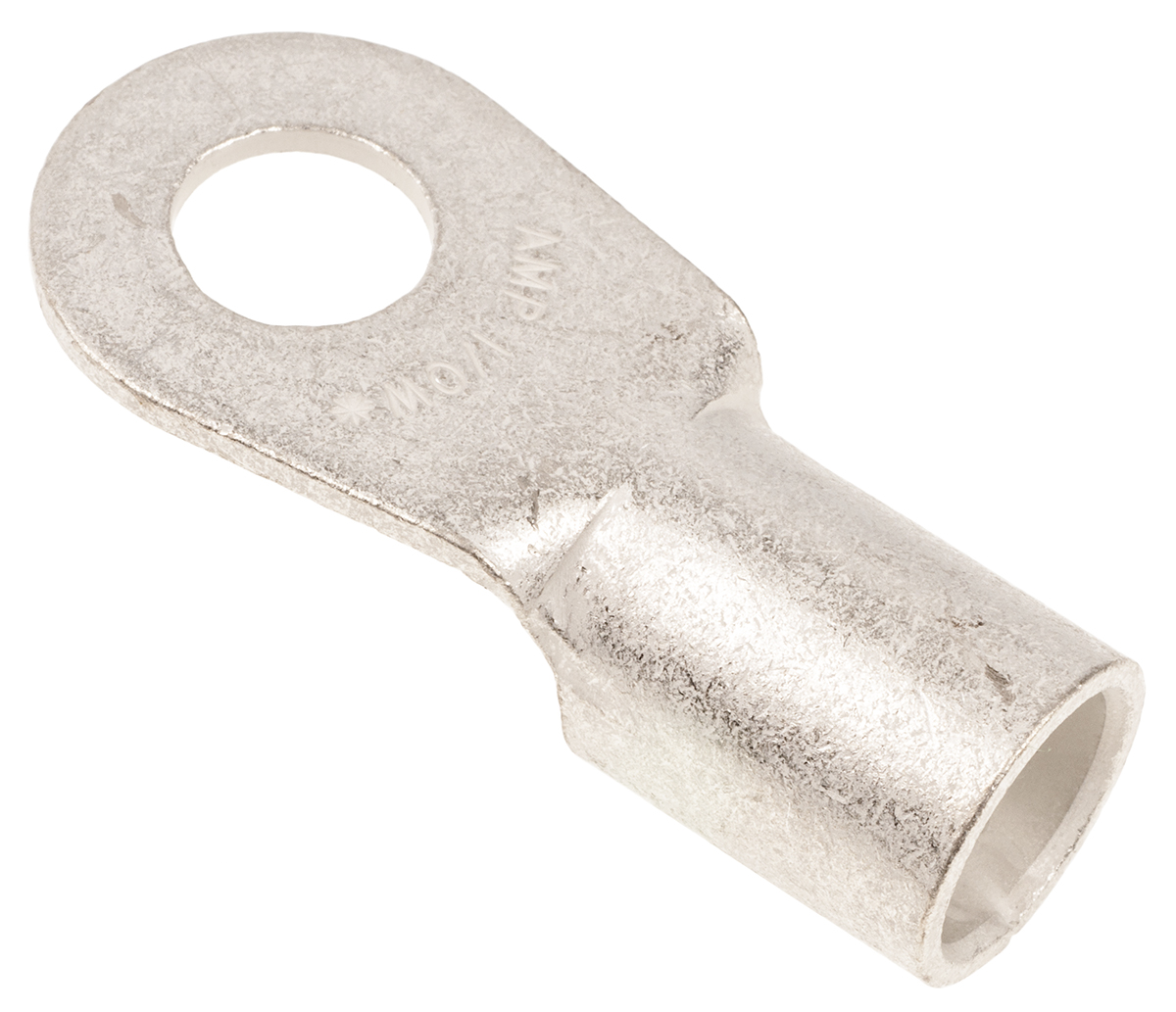 This is Solistrand Series Uninsulated Tin Plated Crimp Ring Terminal M10 Stud Size 42.4mm² to 60.6mm² manufactured by TE Connectivity. The manufacturer part number is 160000. The wire has a maximum size of 60.6mm². The high-quality tin is used as contact plating material. The product solistrand, is a highly preferred choice for users. While the minimum wire size AWG includes 1/0awg. It is 1.8mm thick. It has a standard m10 size stud . Moreover, the inner ring is about 10.5mm in diameter . In addition, its outlet ring diameter is about 22.2mm . It has an overall length of 49.7mm. Insulation Option: uninsulated. Its maximum wires size includes 1/0awg. On the other hand, the wire has 42.4mm² of minimum size. The product is made from sturdy copper materials.