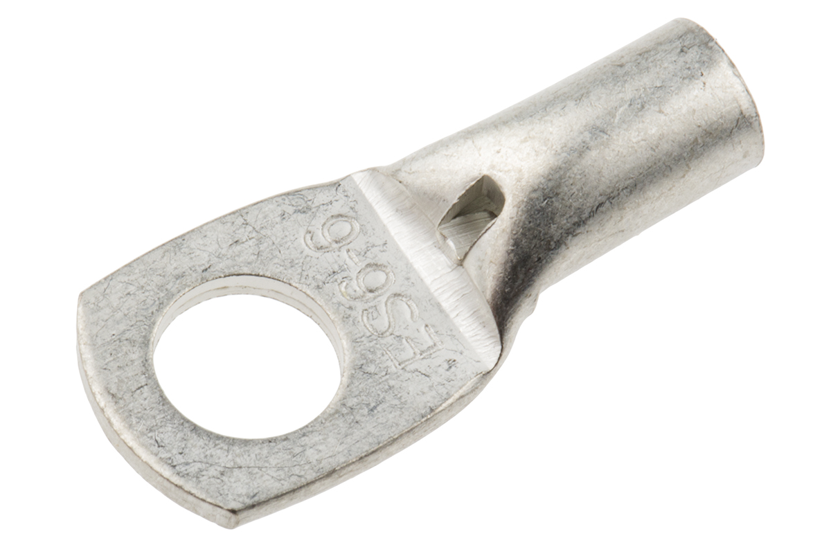 This is Uninsulated Tin Plated Tubular Ring Terminal 6mm Stud Size 6mm² to 6mm² manufactured by RS Pro. The manufacturer part number is 841-7598. It is supplied as unshrouded. The wire has a maximum size of 6mm². It has a decent natural colour. While the minimum wire size AWG includes 12awg. It is 0.95mm thick. It has a standard 6mm size stud . Moreover, the inner ring is about 4mm in diameter . In addition, its outlet ring diameter is about 5.9mm . The high-quality tin is used as contact plating material. It has an overall length of 24.6mm. Insulation Option: uninsulated. Its maximum wires size includes 10awg. On the other hand, the wire has 4mm² of minimum size. It has a maximum operating temperature of +120°c. Whereas, the minimum operating temperature of the product is -30°c. It has a robust copper insulation material. The product is made from sturdy copper materials.